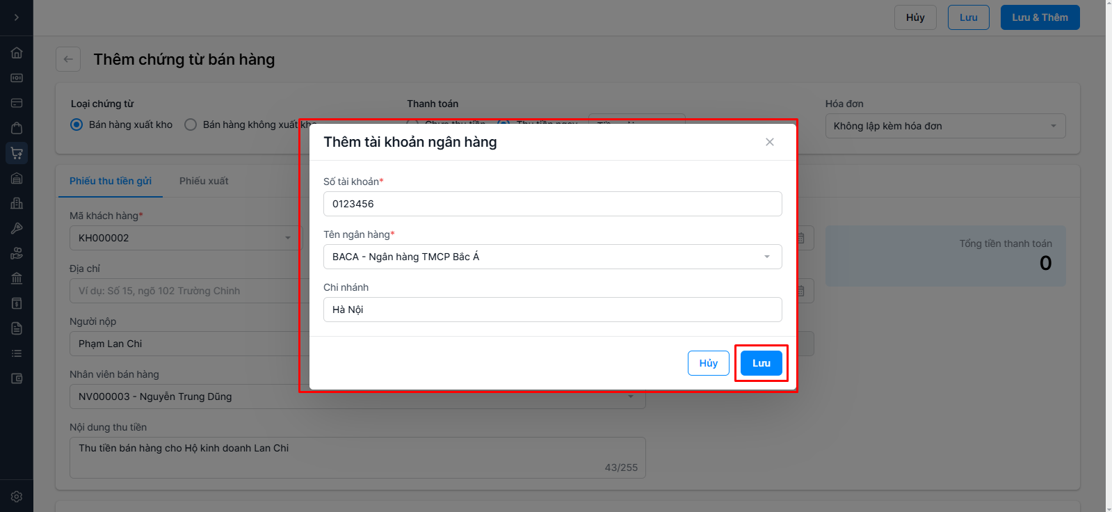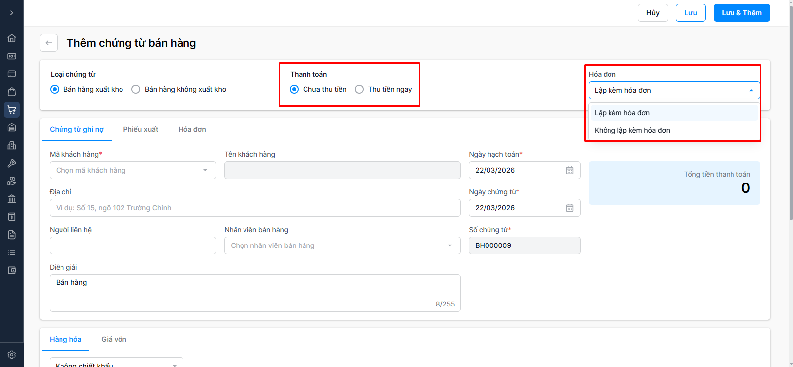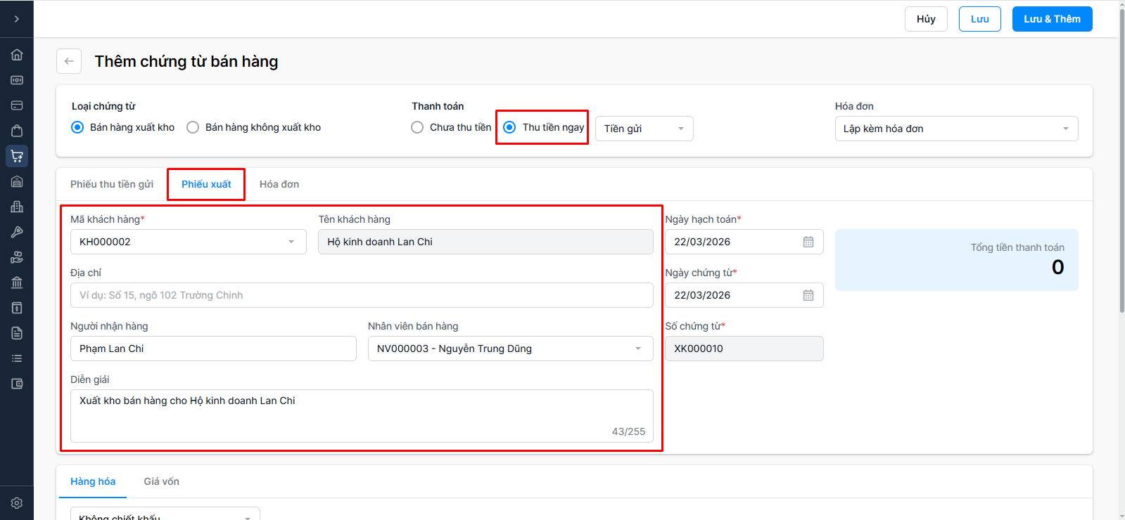 Thu tiền ngay: Bán hàng thu tiền ngay (Chọn Tiền mặt hoặc Tiền gửi)