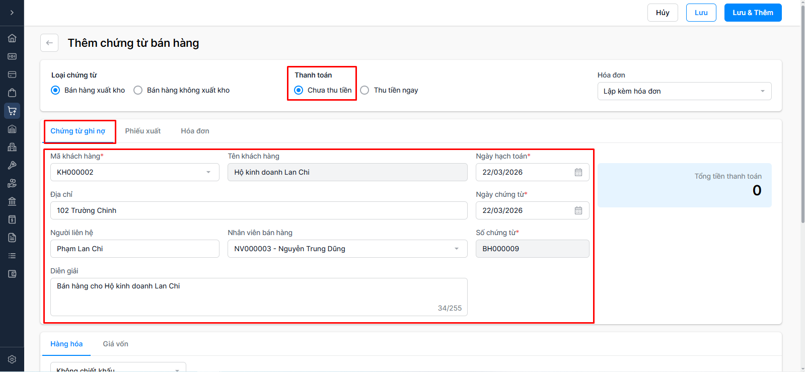 Trường hợp 1: Hình thức thanh toán - Chưa thu tiền → Nhập thông tin Chứng từ ghi nợ