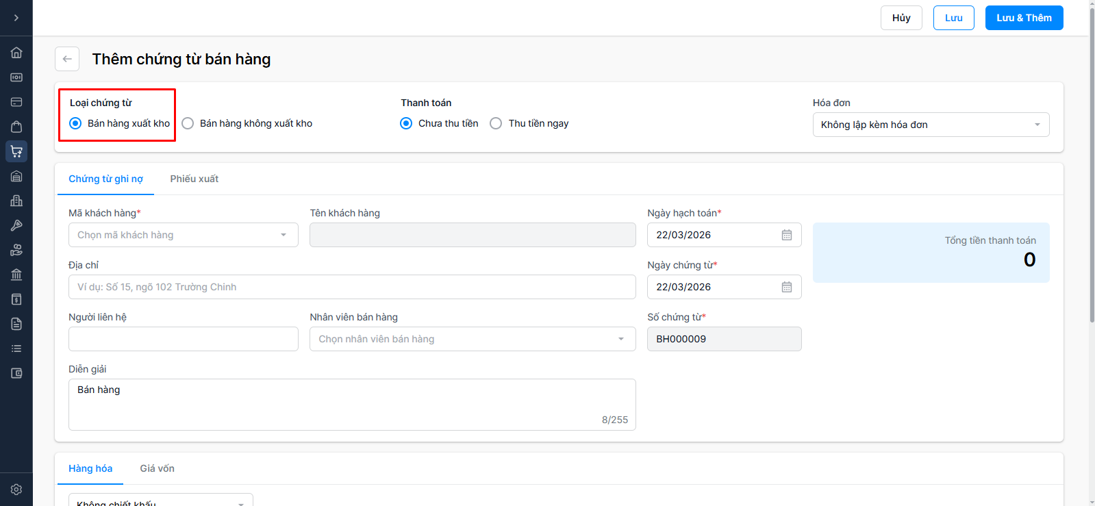 Nhấn nút + Thêm chứng từ bán hàng màu xanh ở góc trên bên phải màn hình Danh sách bán hàng, phần mềm sẽ điều hướng đến màn hình Thêm chứng từ bán hàng.
