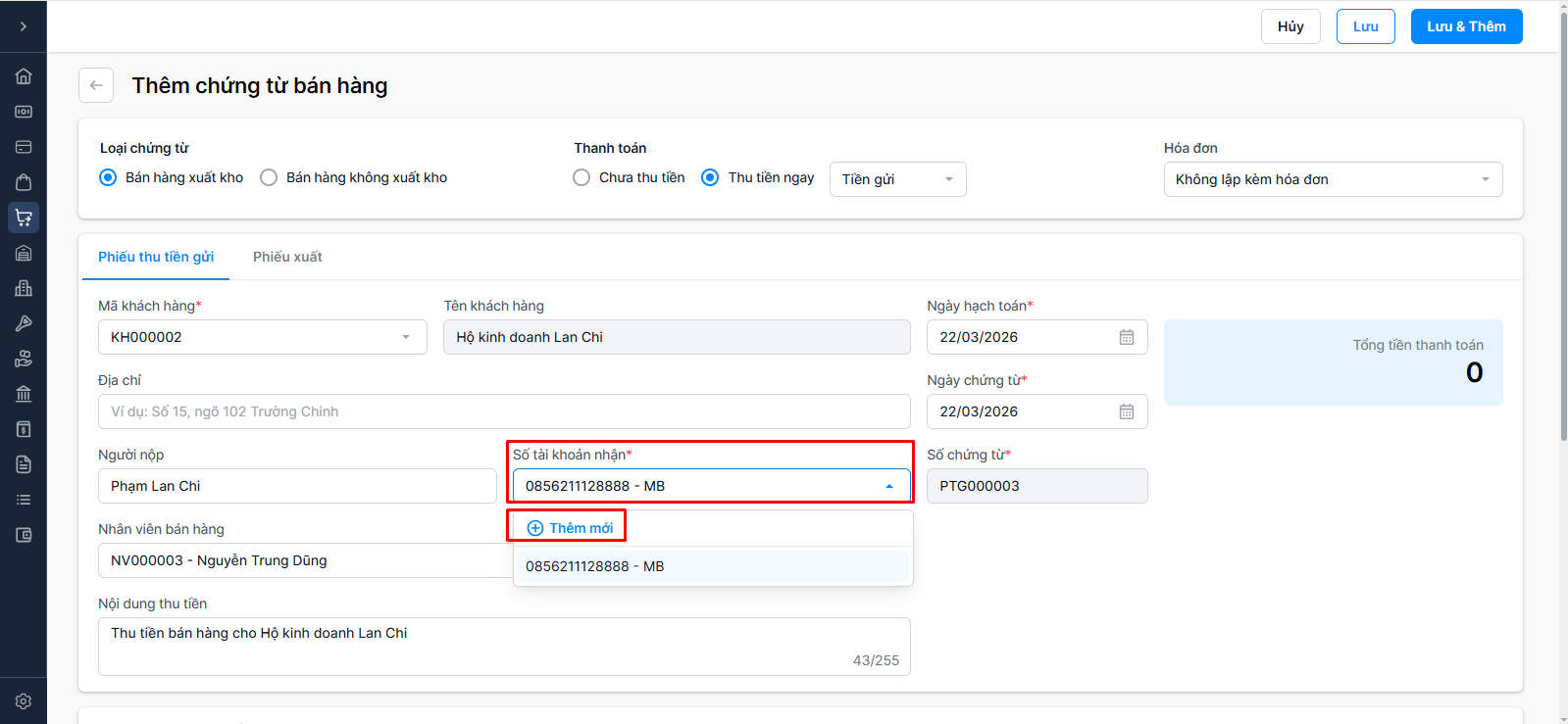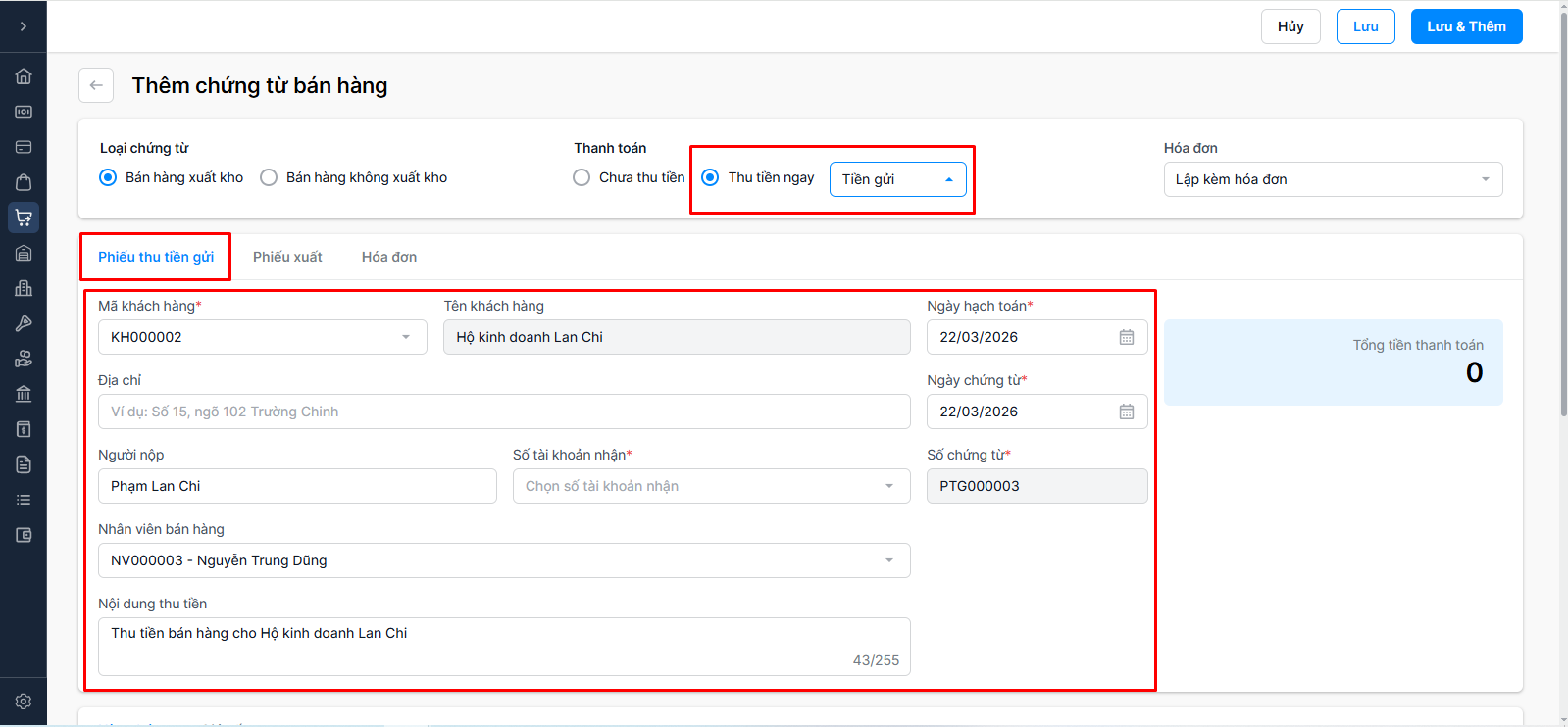 Trường hợp 2: Hình thức thanh toán - Thu tiền ngay (Tiền mặt) → Nhập thông tin Phiếu thu tiền mặt