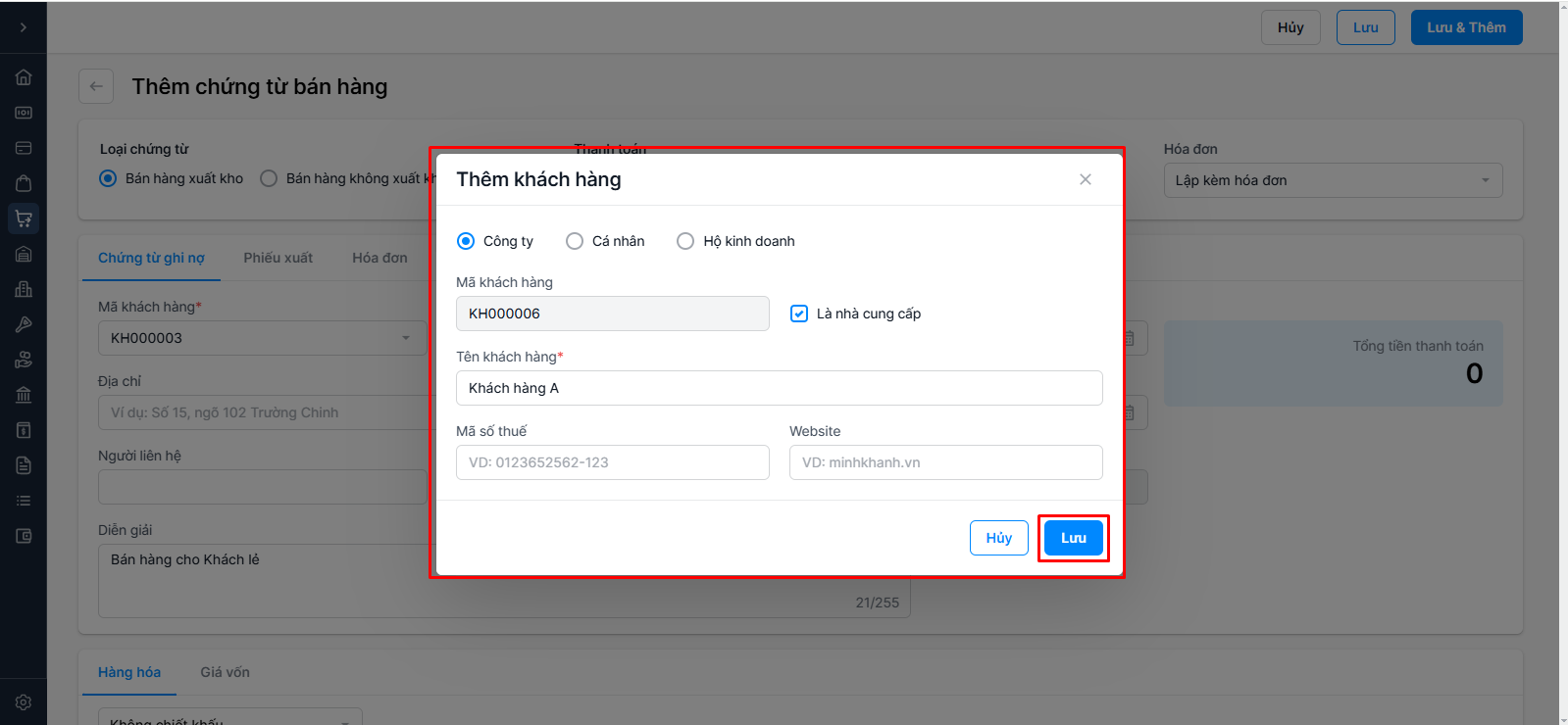 Bạn có thể nhấn nút Thêm mới để thêm nhanh thông tin khách hàng mới.
