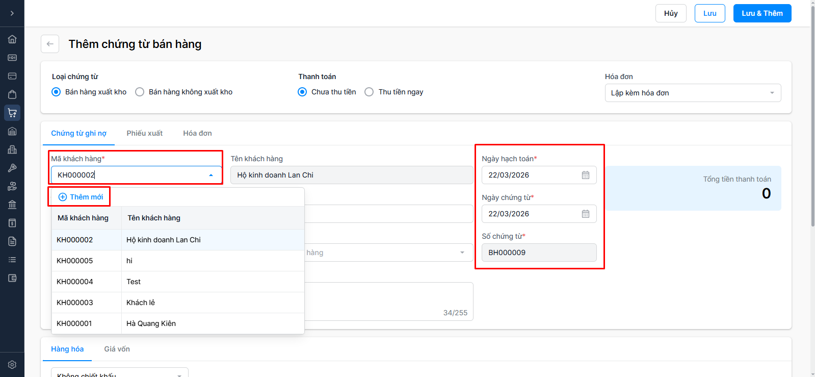 Ngày hạch toán (bắt buộc): Ngày ghi sổ kế toán (Hiển thị mặc định là thời điểm tạo)