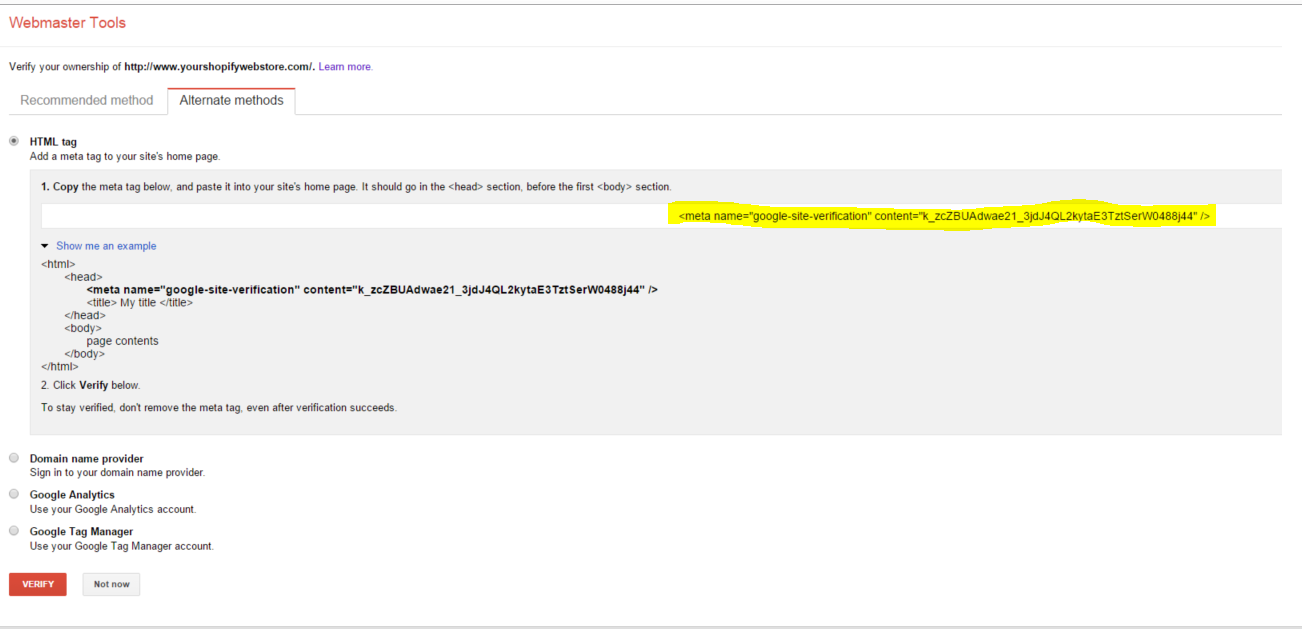 - Nhập địa chỉ website của bạn rồi chọn "Alternate Methods" > "HTML tag" và sao chép đoạn mã được cung cấp.
