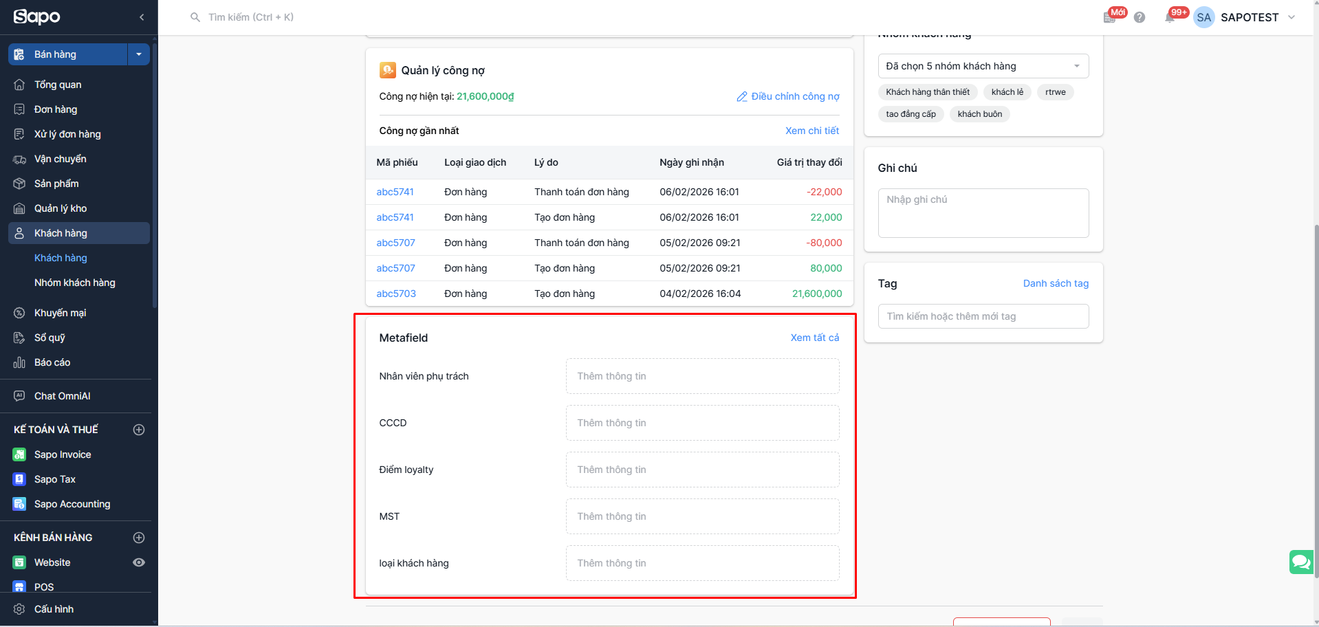 - Tại giao diện chi tiết khách hàng, chọn mục Tag.