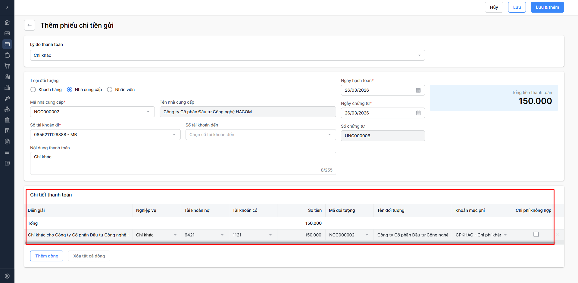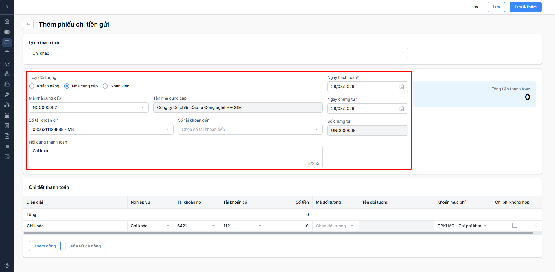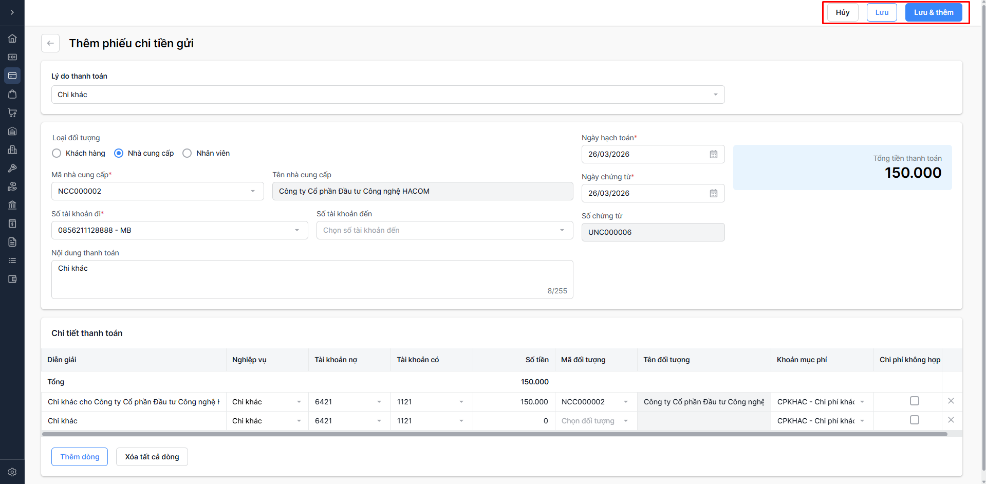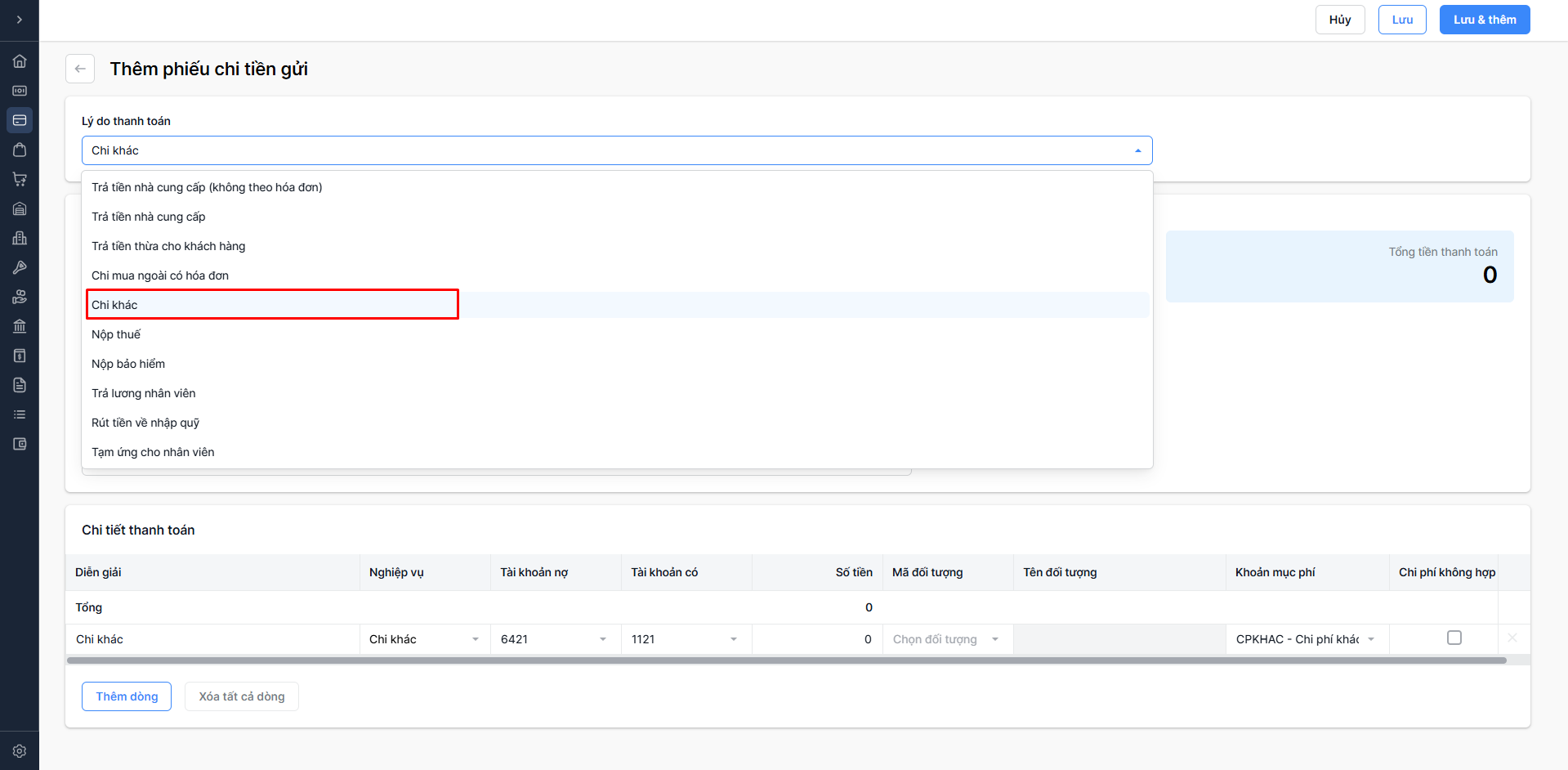- Chọn Lưu & thêm: Lưu thông tin phiếu chi vừa nhập và tiếp tục thêm phiếu chi mới.