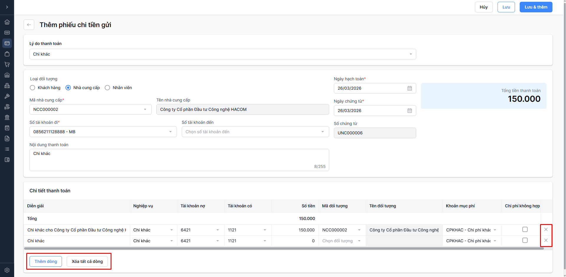 - Xóa tất cả dòng: Chỉ hiển thị khi có ít nhất 2 chứng từ nghiệp vụ chi tiền (ngoại trừ Chiết khấu thanh toán) để xoá tất cả số tiền chi bạn nhập liệu ở trên.