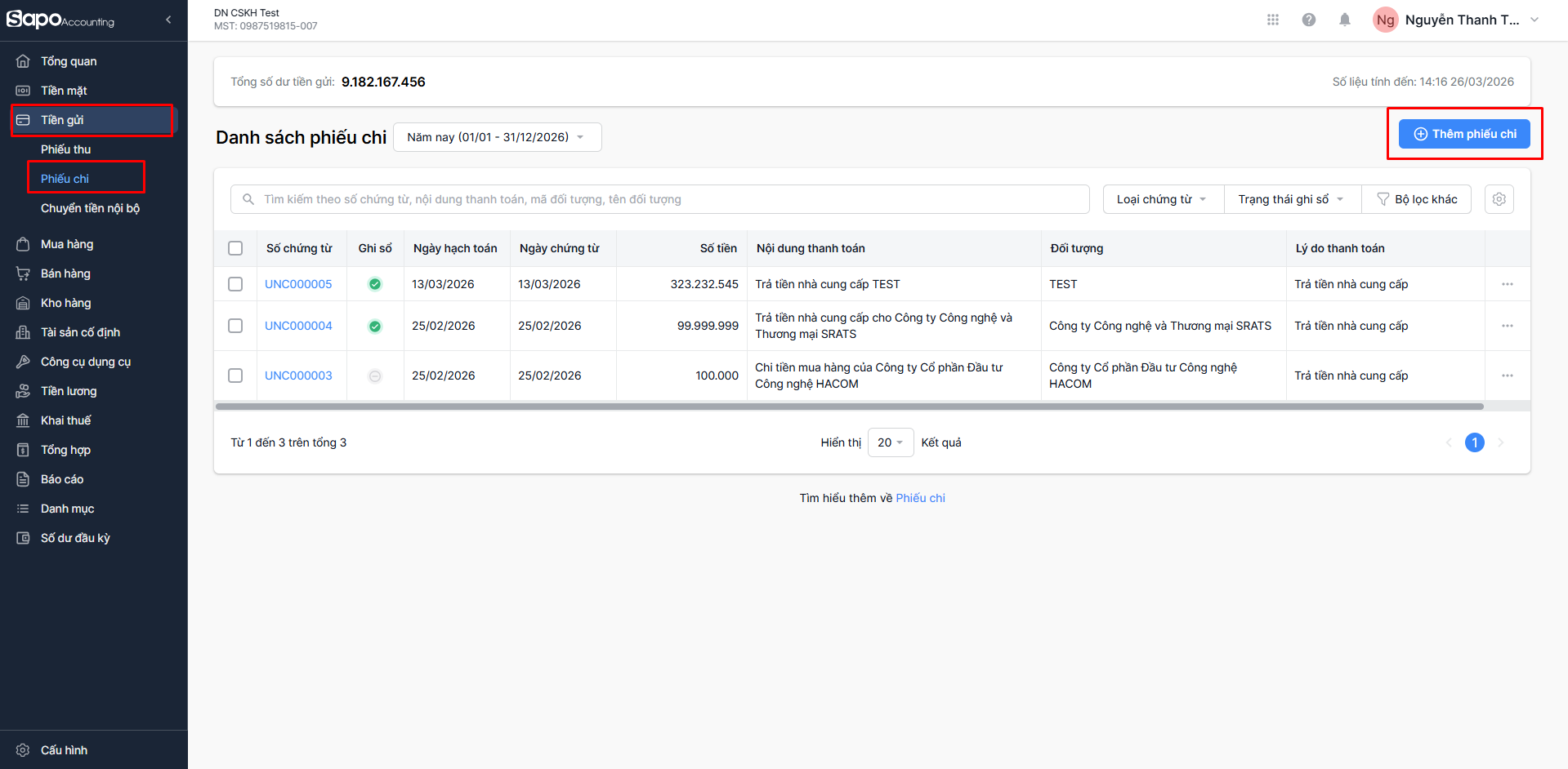 - Trên thanh Menu bên trái trang quản trị, chọn Tiền gửi > Phiếu chi, phần mềm sẽ điều hướng đến màn hình Danh sách Phiếu chi.