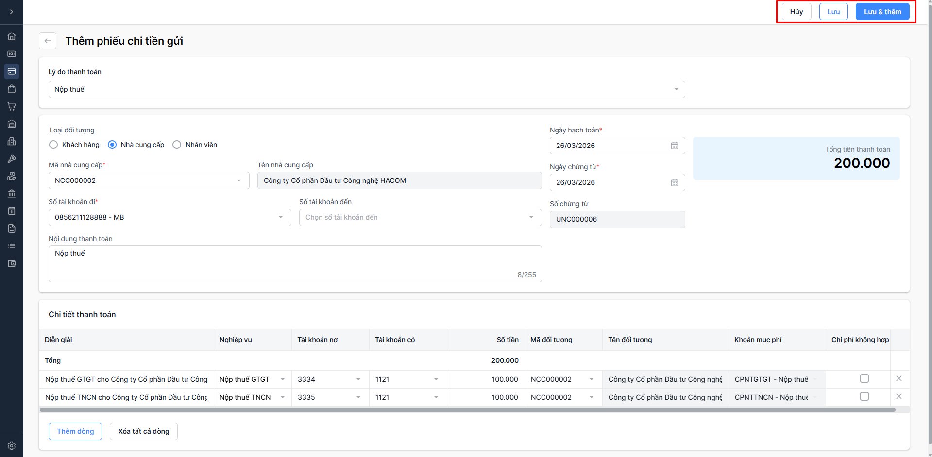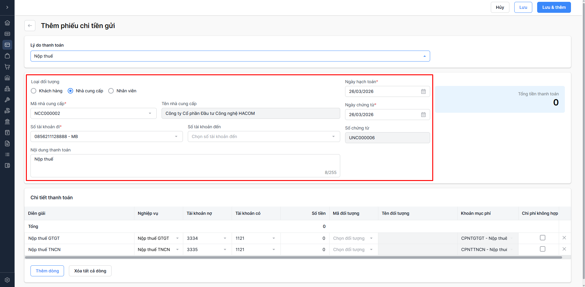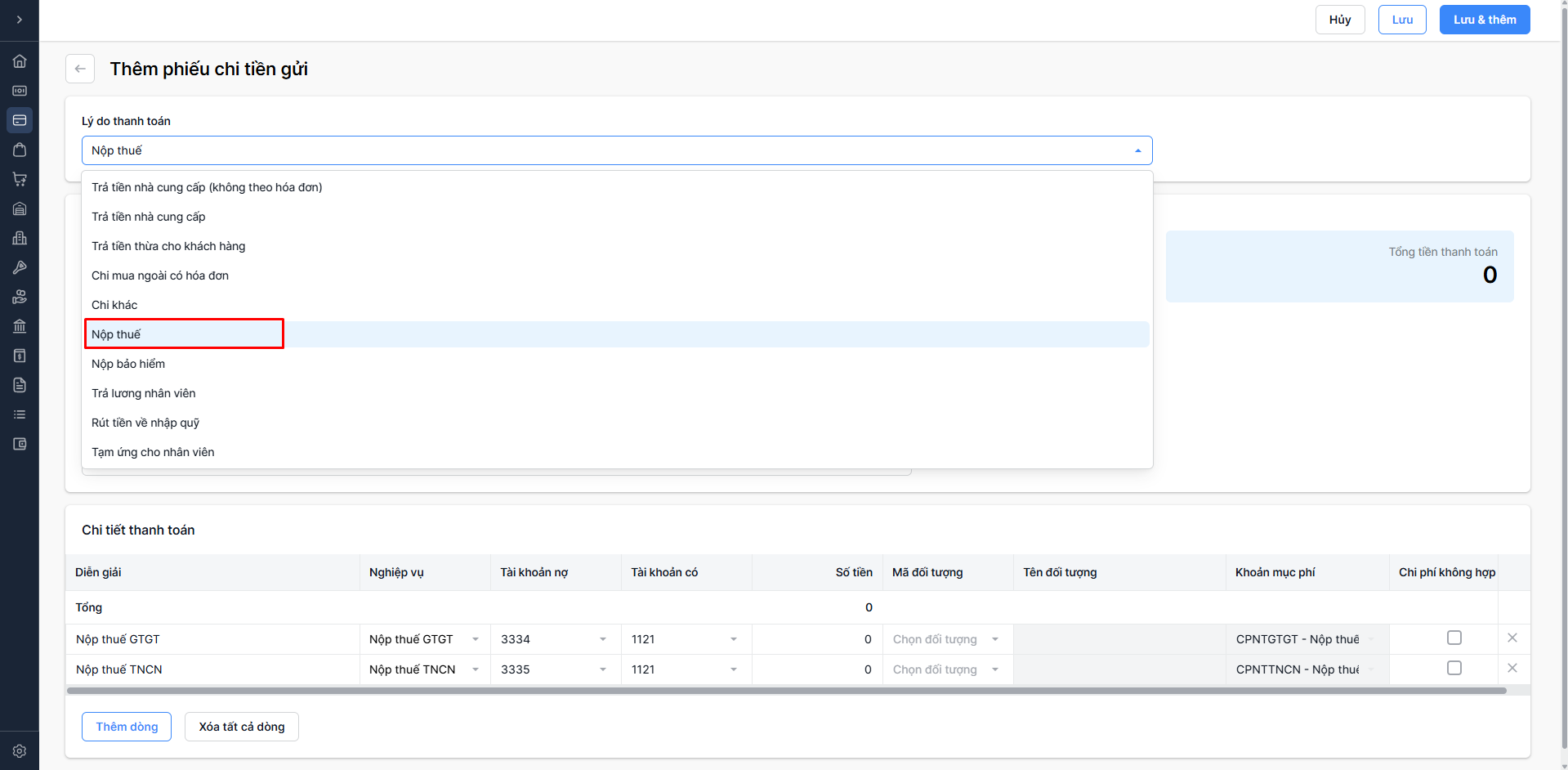 - Chọn Lưu & thêm: Lưu thông tin phiếu chi vừa nhập và tiếp tục thêm phiếu chi mới.