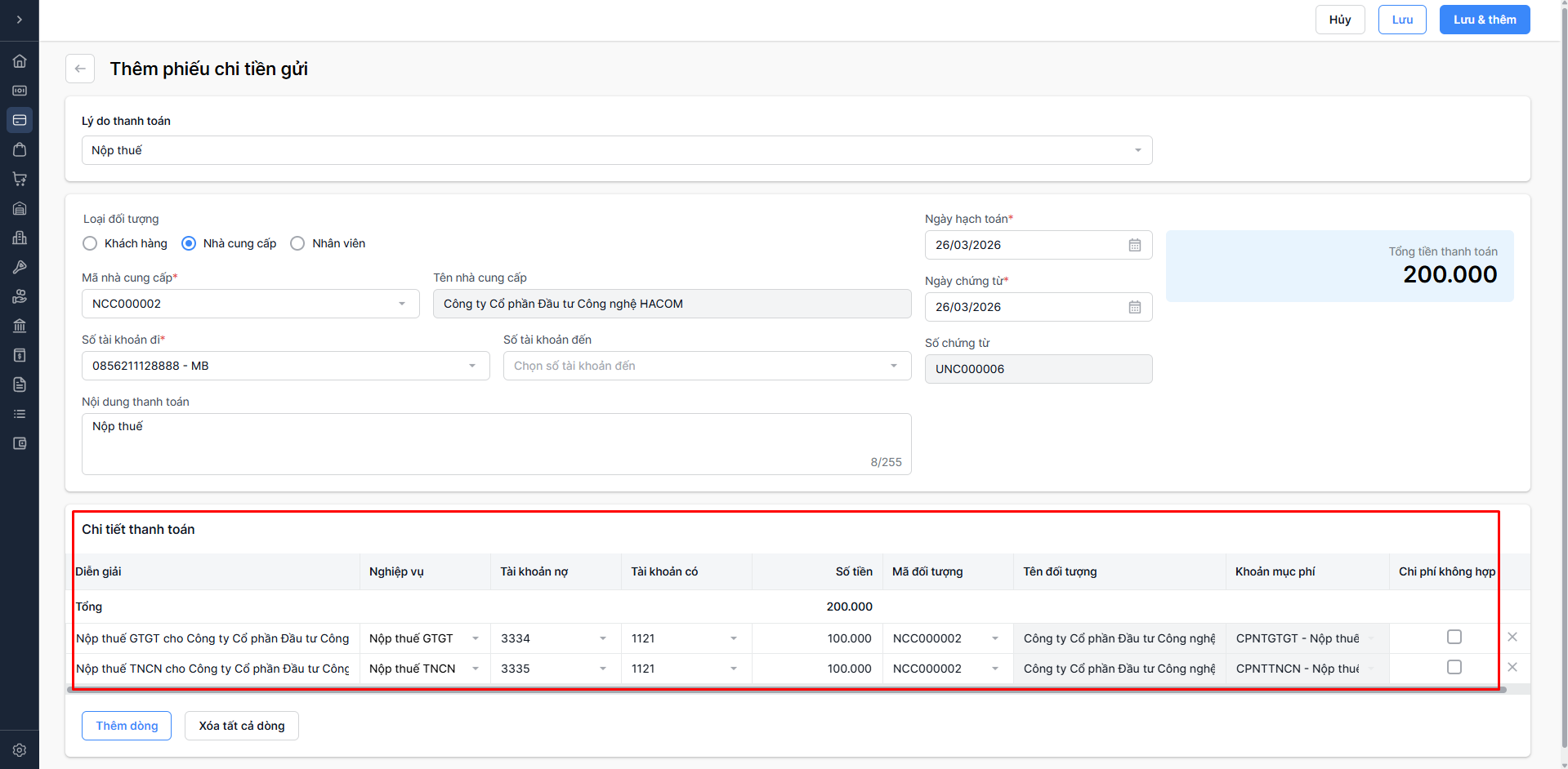 - Tại cột Tài khoản có: Với lý do thanh toán Nộp thuế (GTGT/TNDN), Tài khoản Có sẽ được mặc định là Tài khoản 1121.