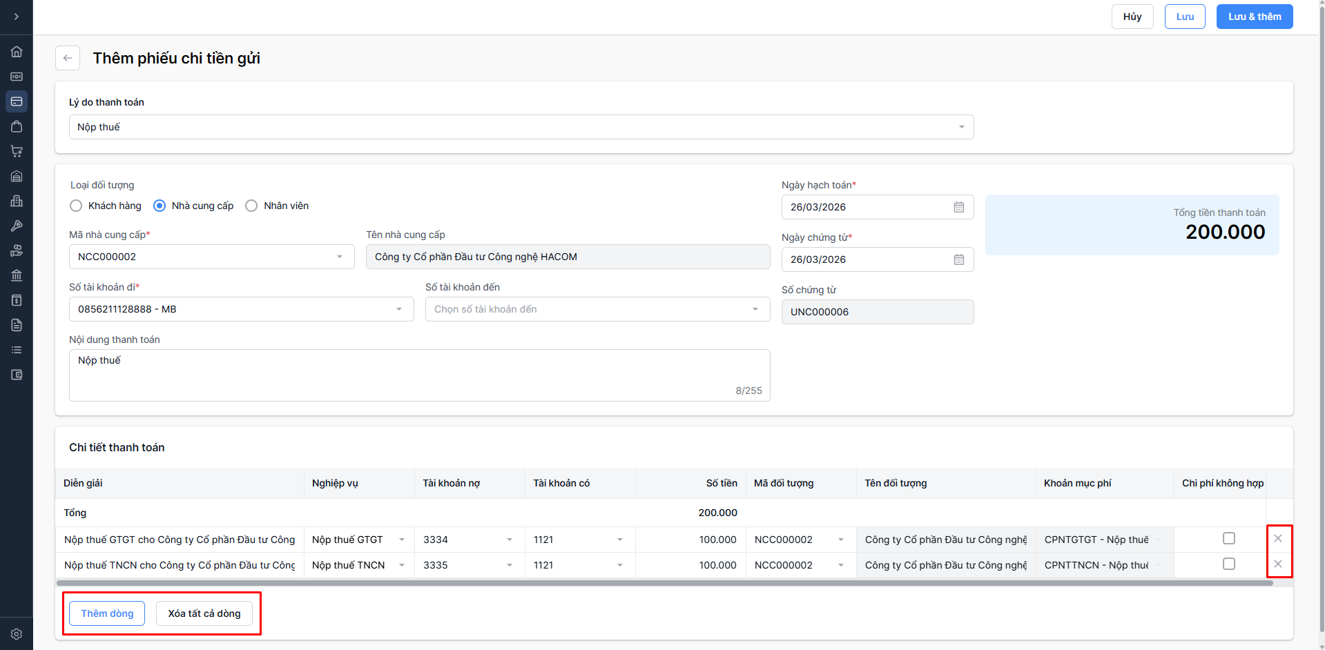 - Xóa tất cả dòng: Chỉ hiển thị khi có ít nhất 2 chứng từ nghiệp vụ chi tiền để xoá tất cả số tiền chi bạn nhập liệu ở trên.