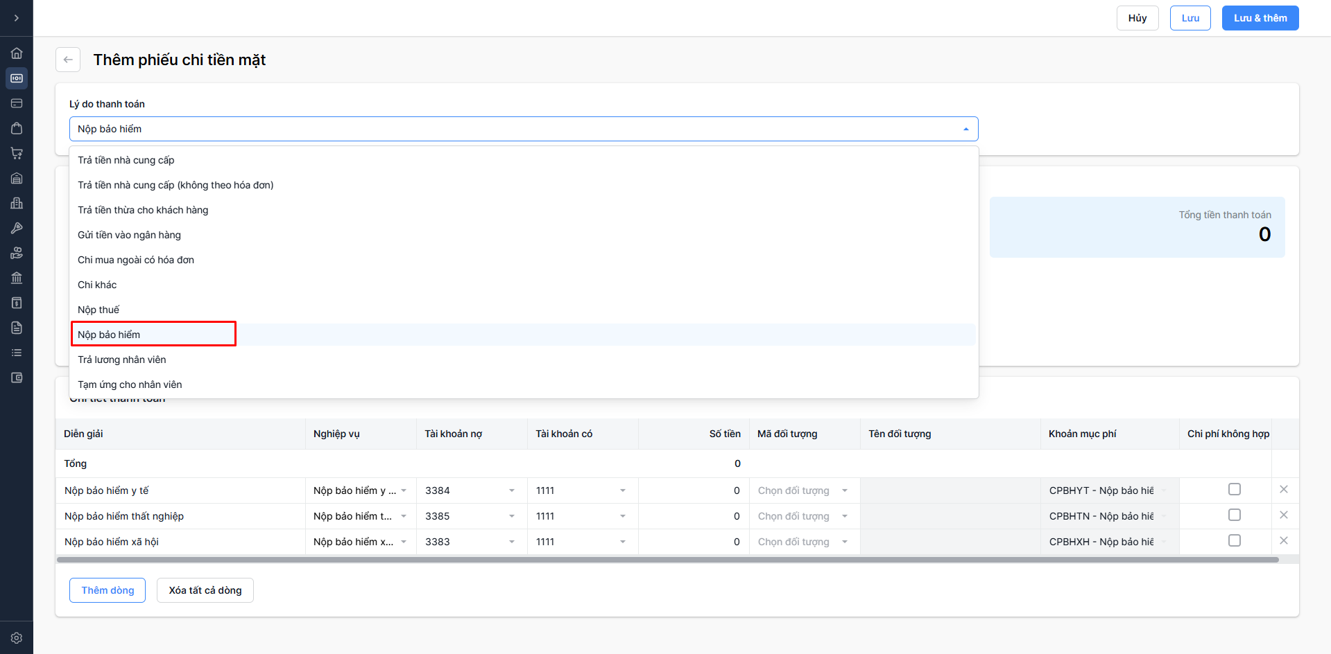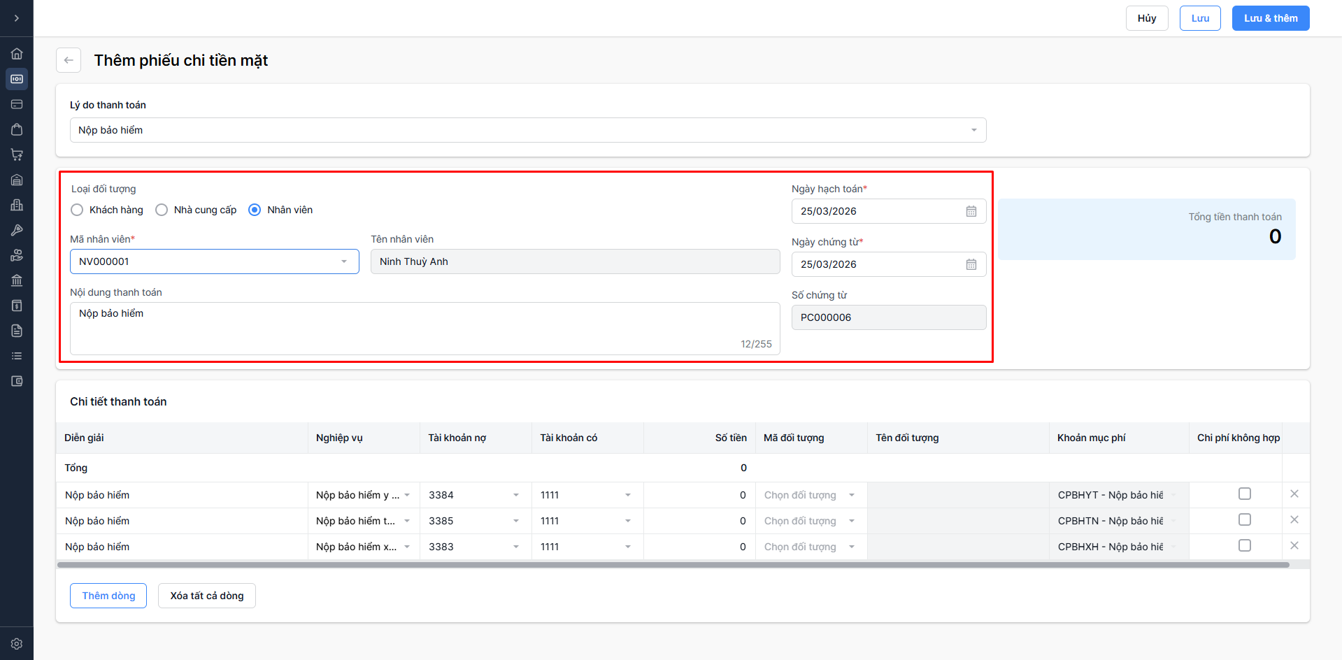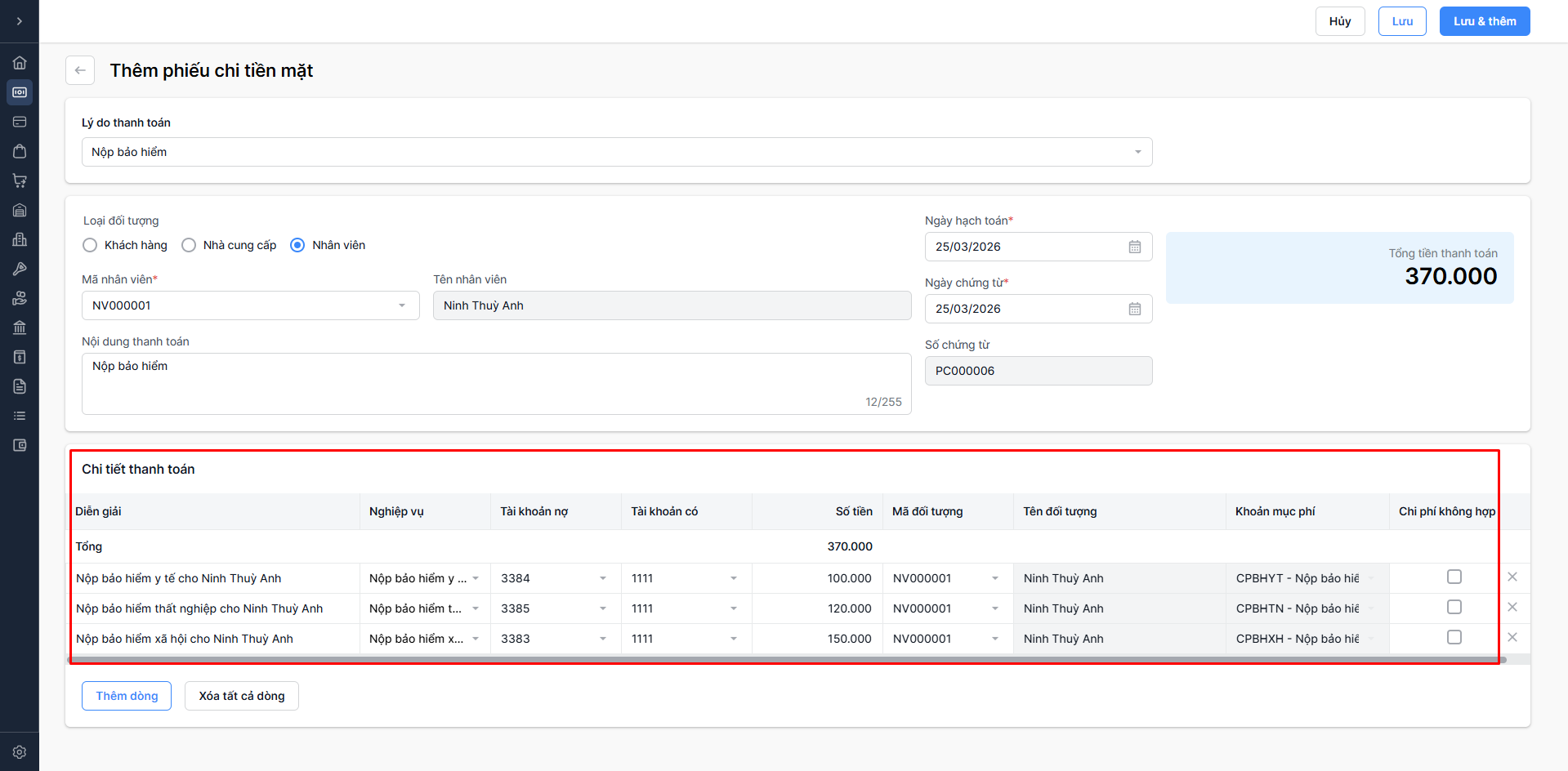 - Chọn Lưu & thêm: Lưu thông tin phiếu chi vừa nhập và tiếp tục thêm phiếu chi mới.