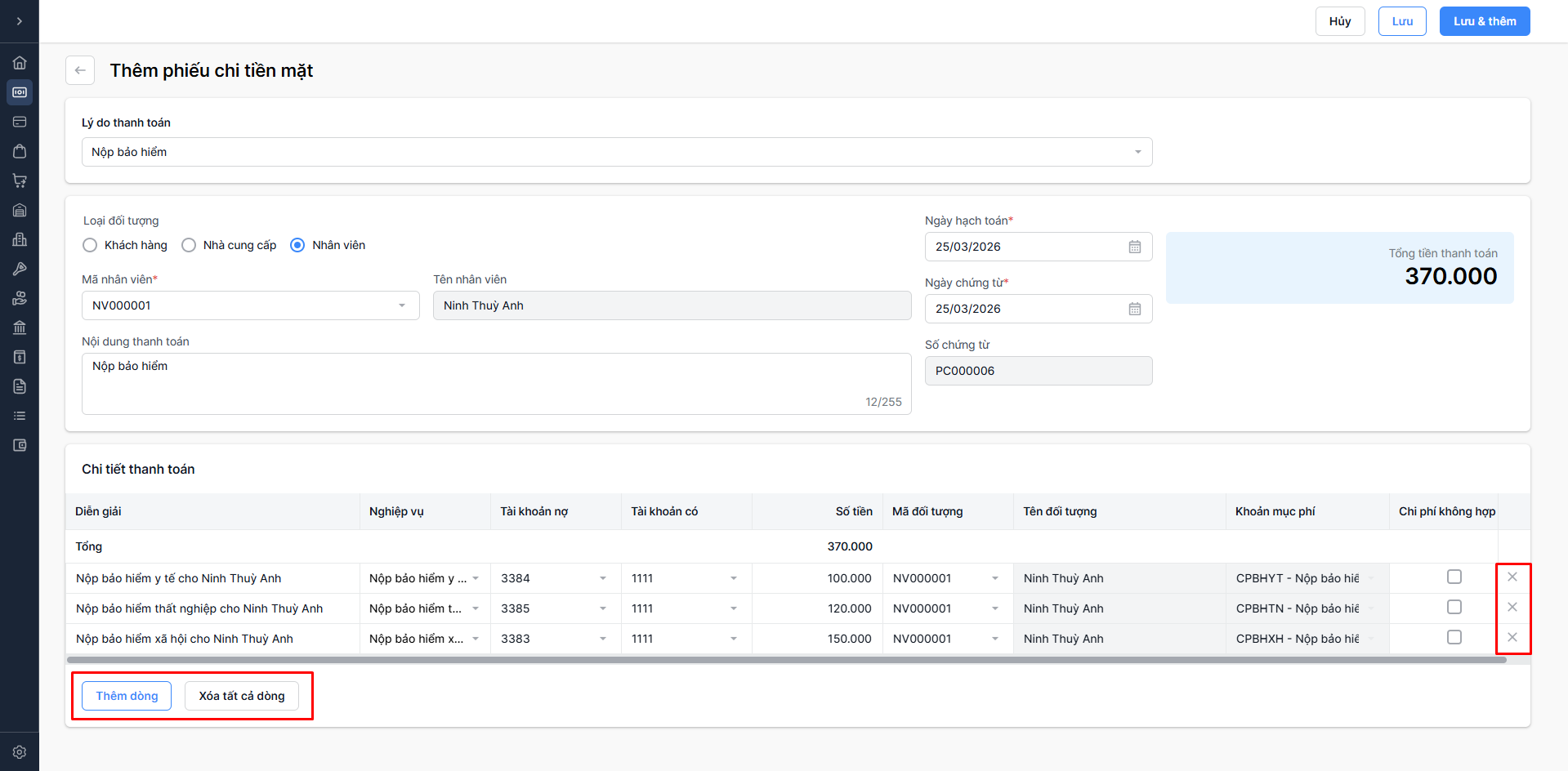 - Xóa tất cả dòng: Chỉ hiển thị khi có ít nhất 2 chứng từ nghiệp vụ chi tiền để xoá tất cả số tiền chi bạn nhập liệu ở trên.