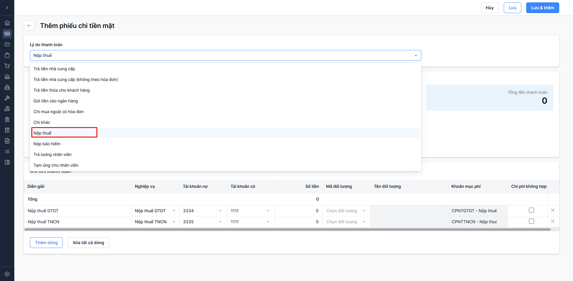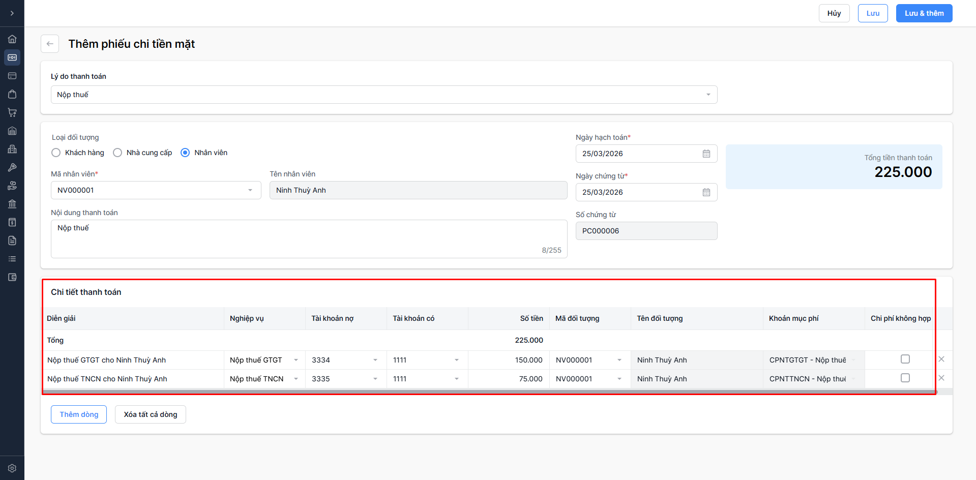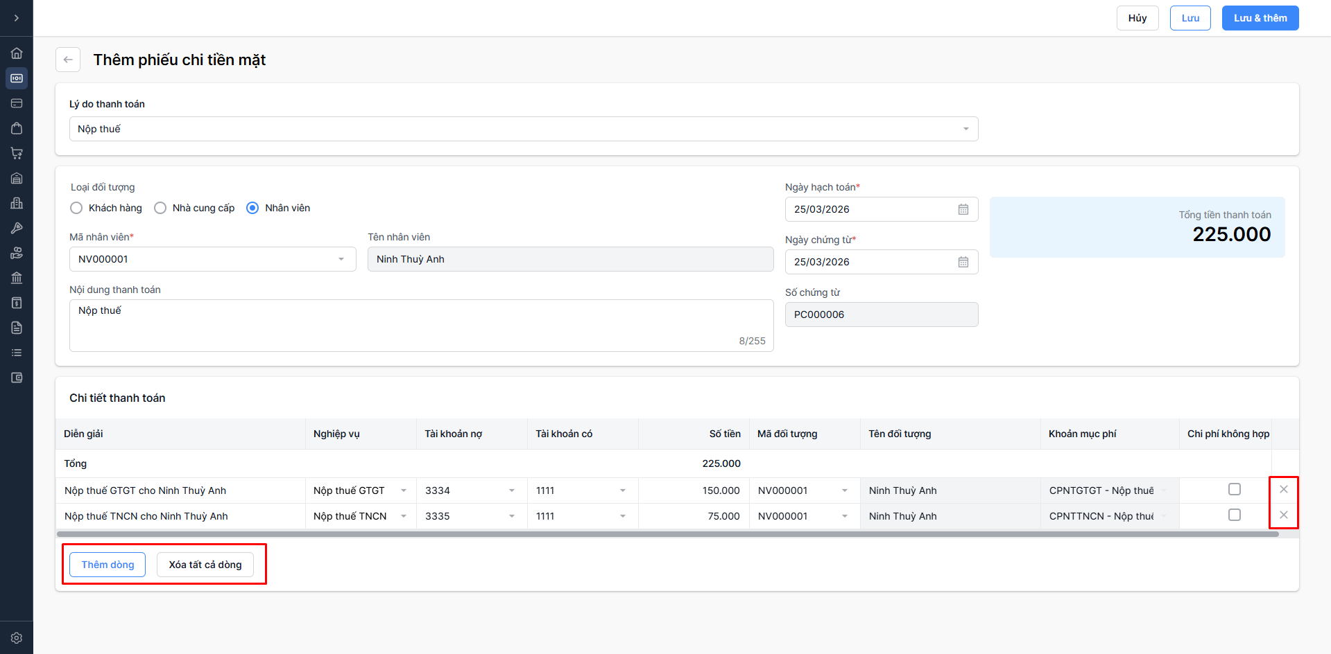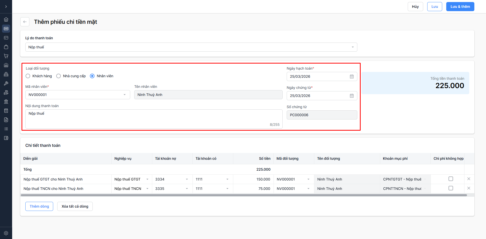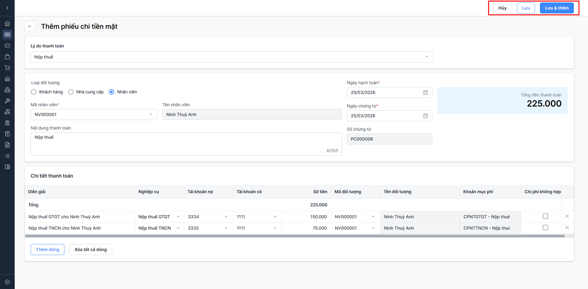 - Chọn Lưu & thêm: Lưu thông tin phiếu chi vừa nhập và tiếp tục thêm phiếu chi mới.