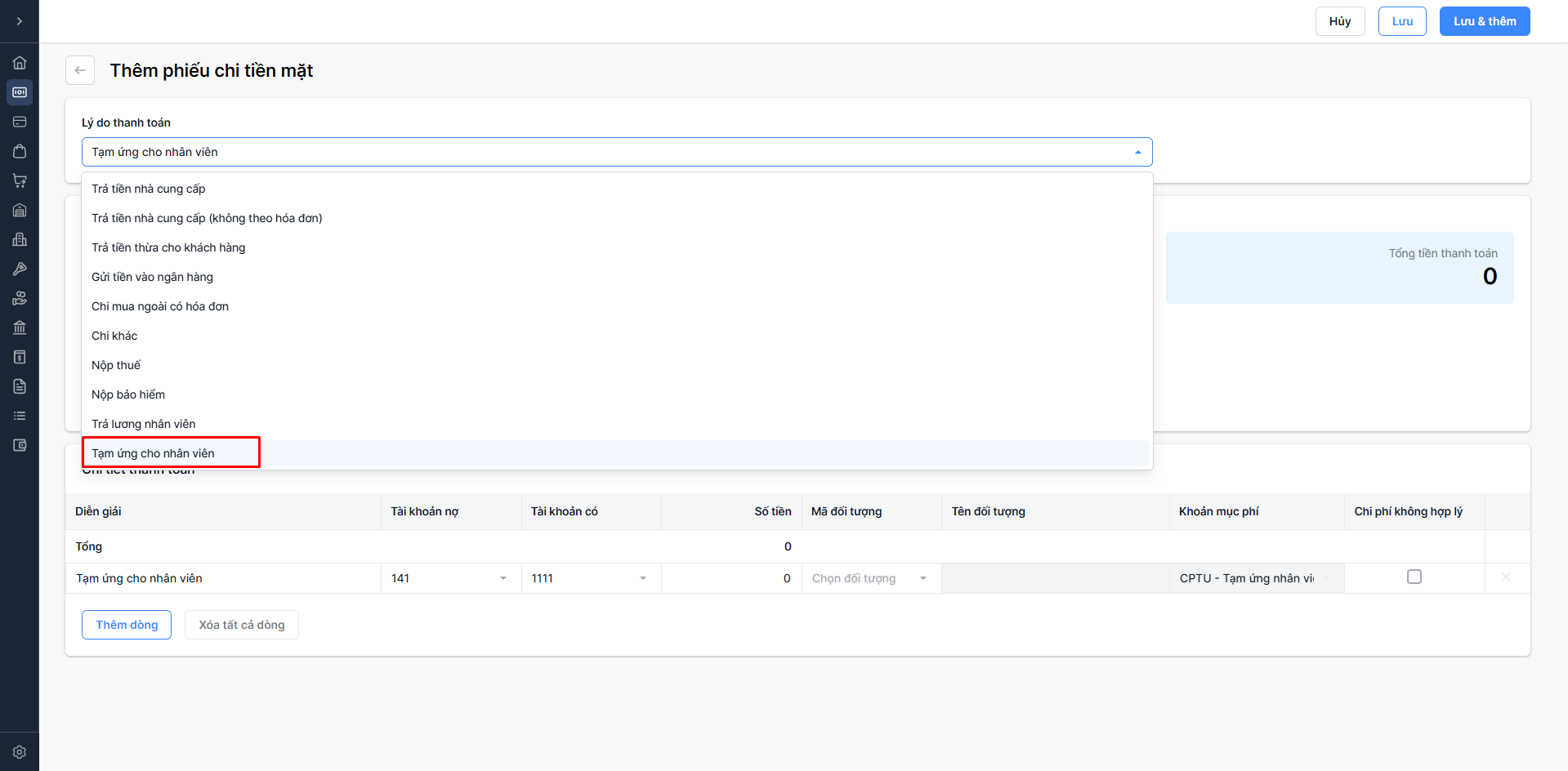 - Chọn Lưu & thêm: Lưu thông tin phiếu chi vừa nhập và tiếp tục thêm phiếu chi mới.