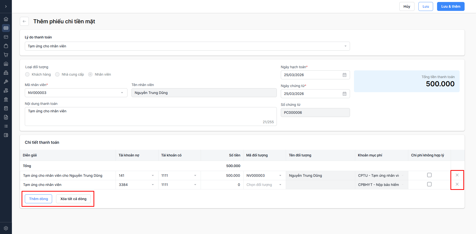 - Xóa tất cả dòng: Chỉ hiển thị khi có ít nhất 2 chứng từ nghiệp vụ chi tiền để xoá tất cả số tiền chi bạn nhập liệu ở trên.