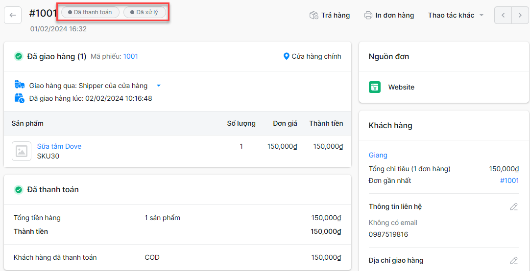 Trường hợp bạn để bên giao hàng thu hộ COD, sau khi phiếu giao hàng được cập nhật trạng thái Đã giao hàng, đơn hàng sẽ chuyển sang trạng thái hoàn thành vì lúc này khách đã nhận hàng và thanh toán tiền cho đối tác vận chuyển. Khi đối tác chuyển tiền về, bạn sẽ làm đối soát và nhận thanh toán, lúc này dòng tiền mới được ghi nhận trong sổ quỹ.