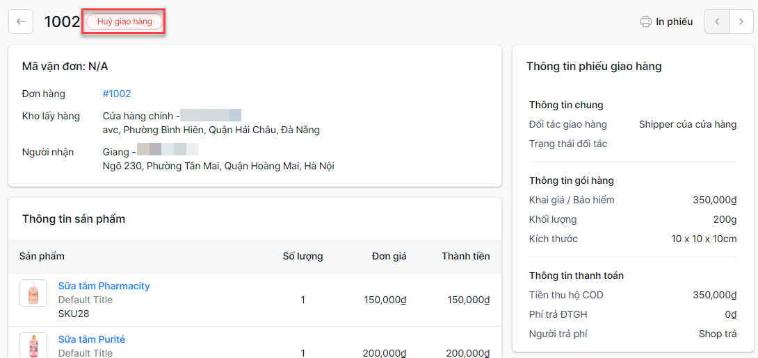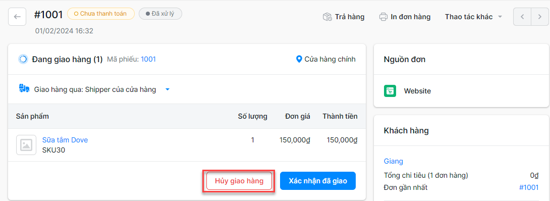 Lúc này, bạn có thể tiếp tục đóng gói xuất kho tiếp, hoặc huỷ đơn hàng luôn nếu khách không lấy hàng nữa.