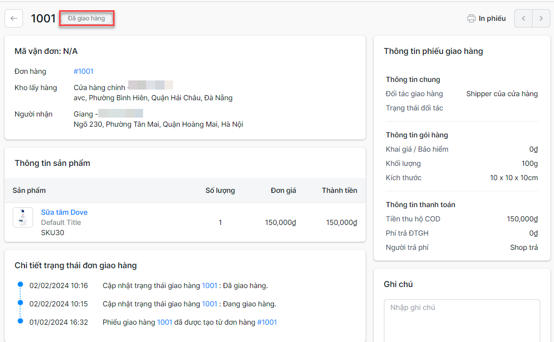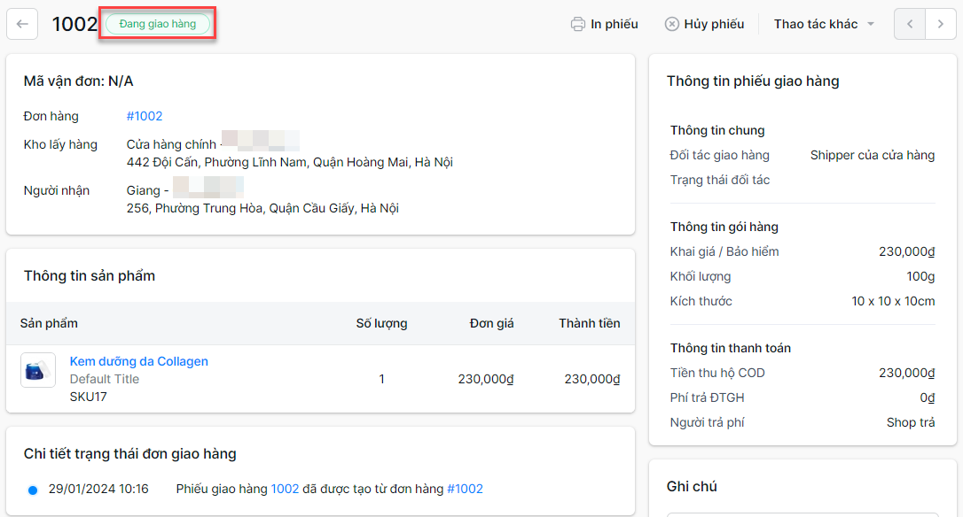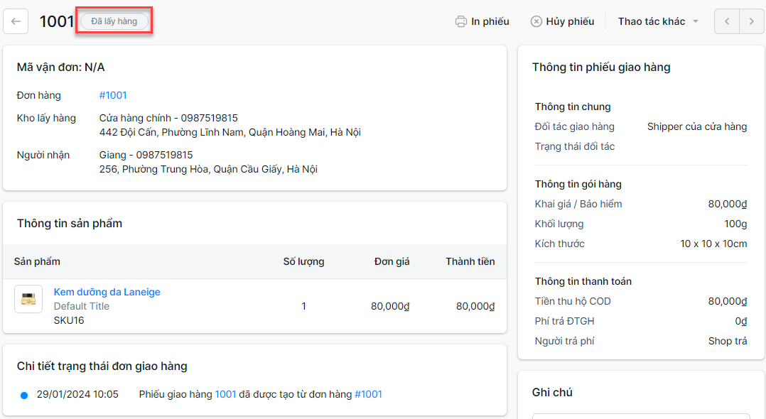 Đơn hàng sau khi tạo đơn chọn dùng dịch vụ giao hàng sẽ tạo thành phiếu giao hàng ở trạng thái chờ lấy hàng. Khách hàng có thể chọn đơn vị vận chuyển tới lấy hoặc gửi tại bưu cục