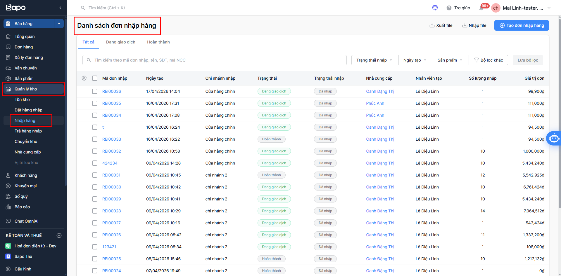- Hệ thống sẽ hiển thị danh sách đơn nhập hàng trên phần mềm.