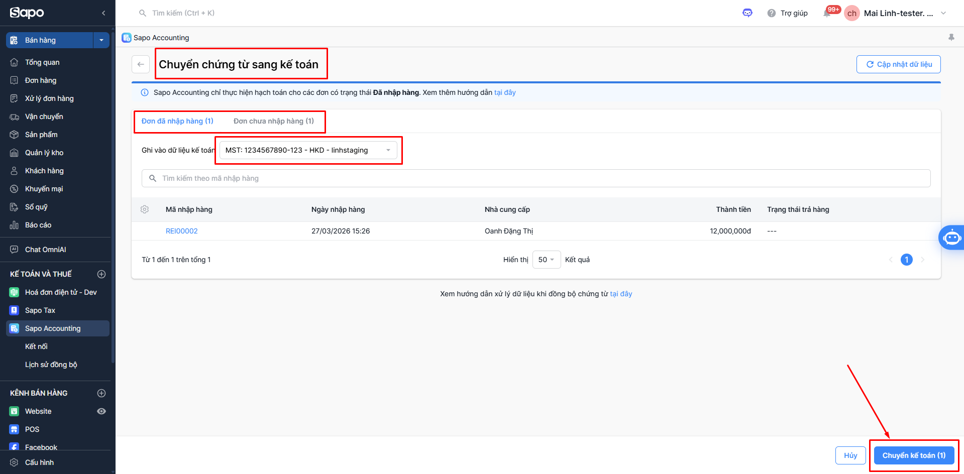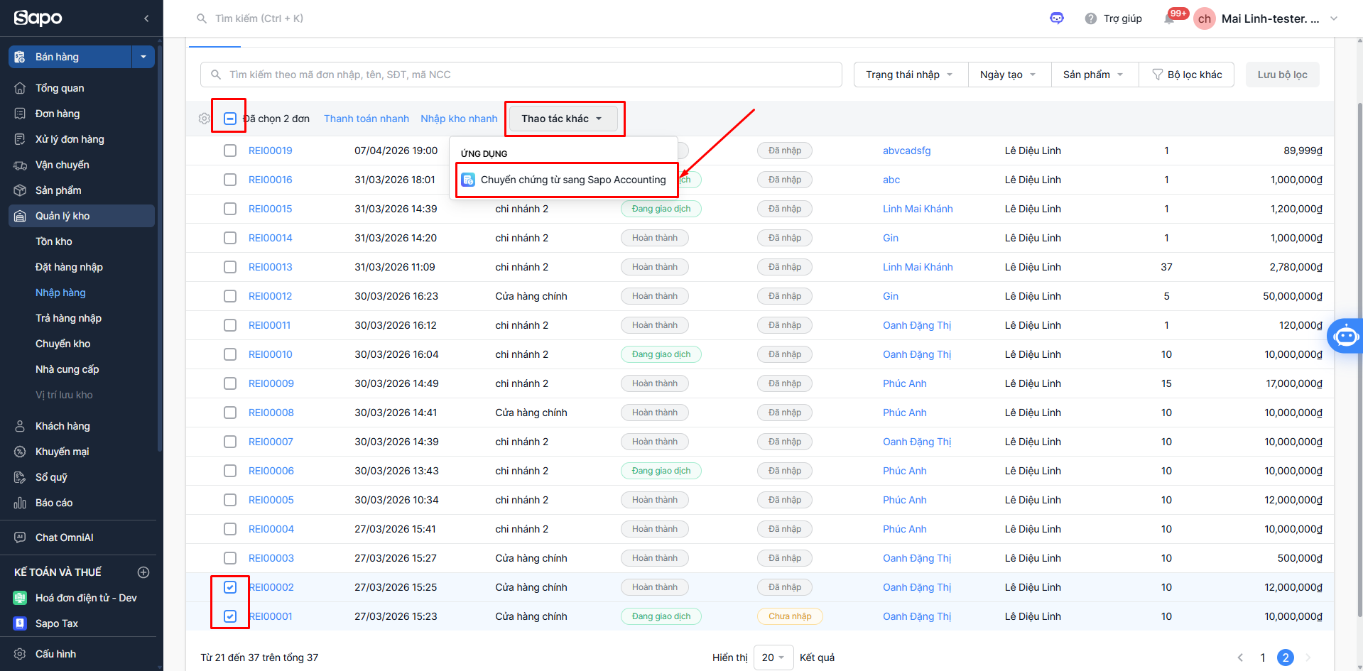 Bước 2: Chọn đơn nhập cần thực hiện chuyển sang Sapo Accounting