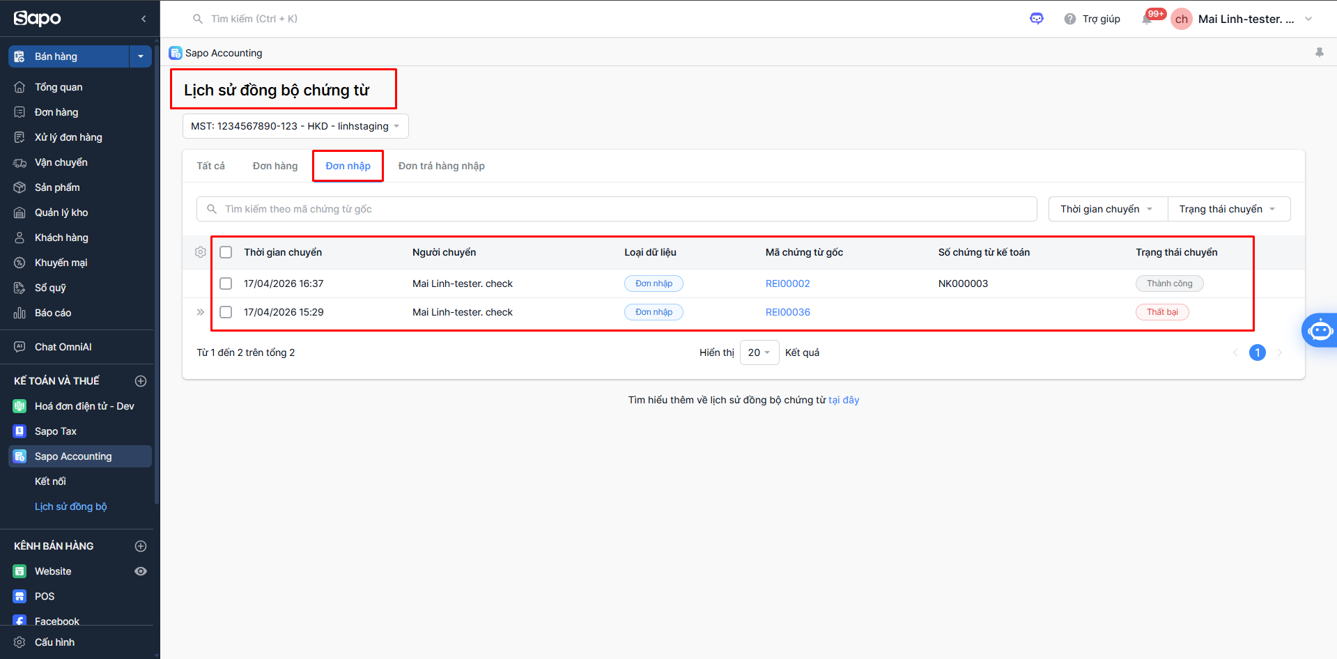 - Để kiểm tra kết quả của các yêu cầu đồng bộ (thành công hay thất bại), bạn truy cập vào tab Lịch sử đồng bộ chứng từ. Xem hướng dẫn chi tiết tại đây.