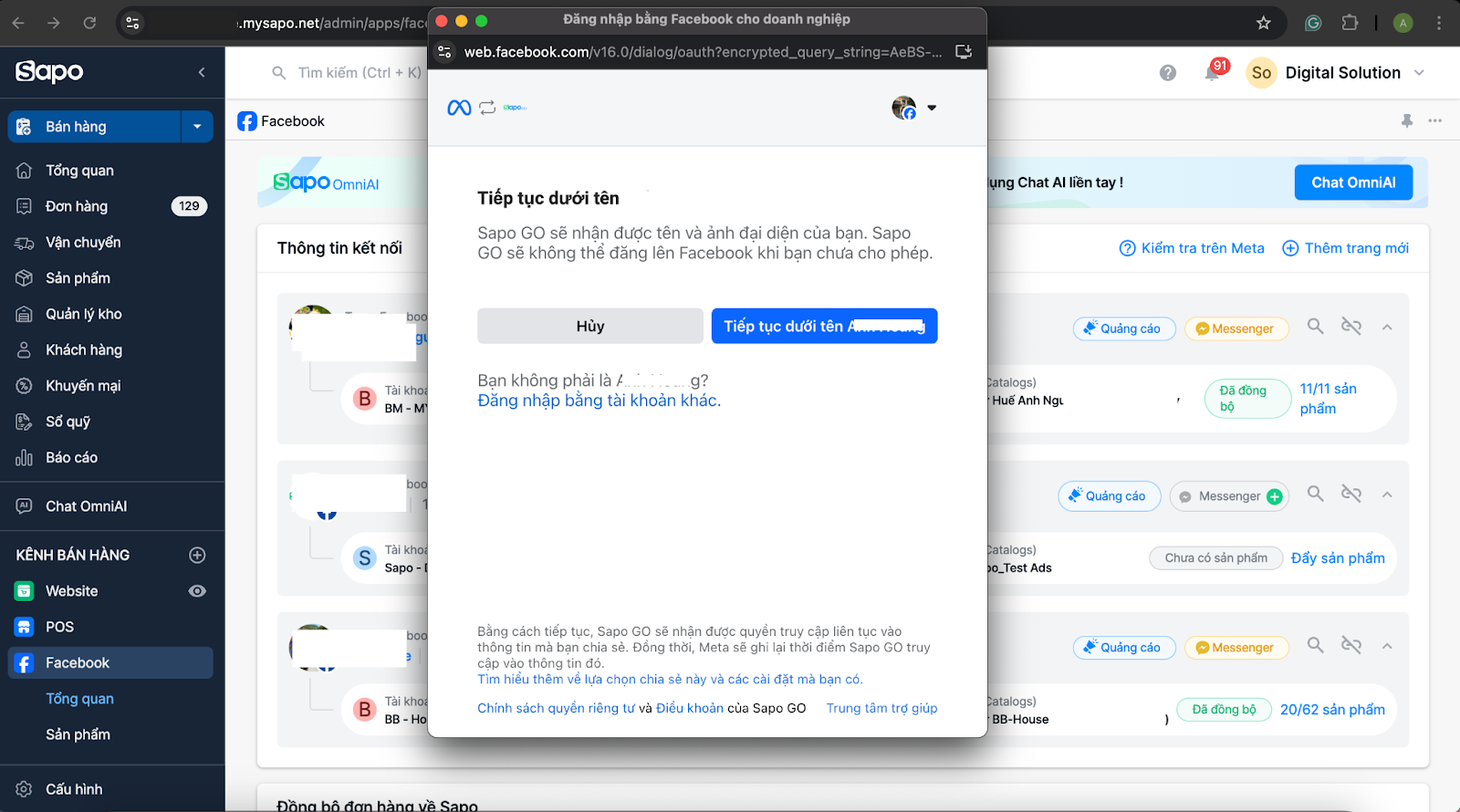 - Thực hiện luồng đăng nhập trên Facebook để kết nối Catalog Messenger.