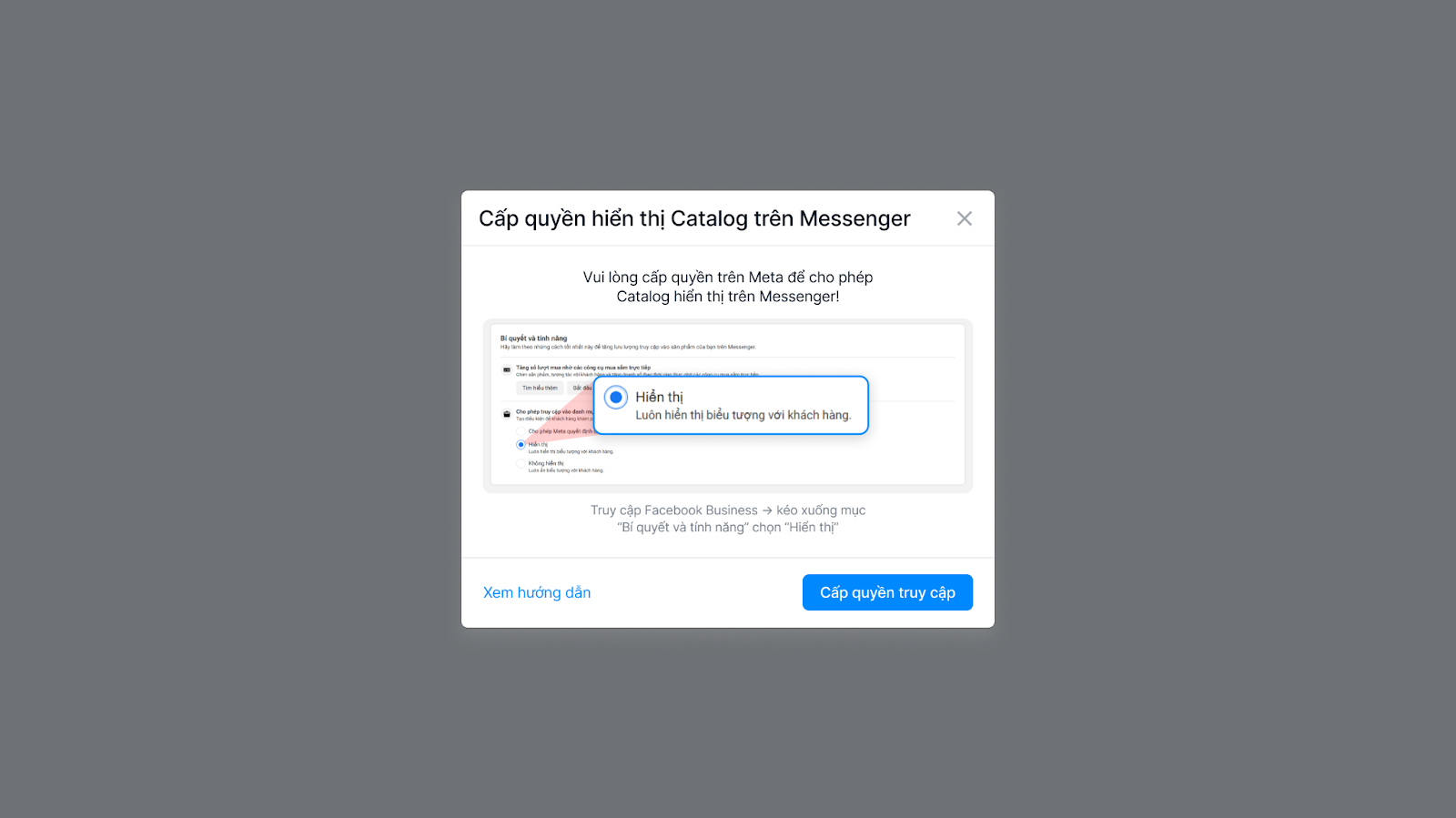 - Sau khi kết nối thành công, Sapo sẽ hiển thị Popup hướng dẫn cấp quyền cho phép hiển thị Catalog trên Messenger. Bạn thực hiện các bước sau trên trang quản lý của Meta: