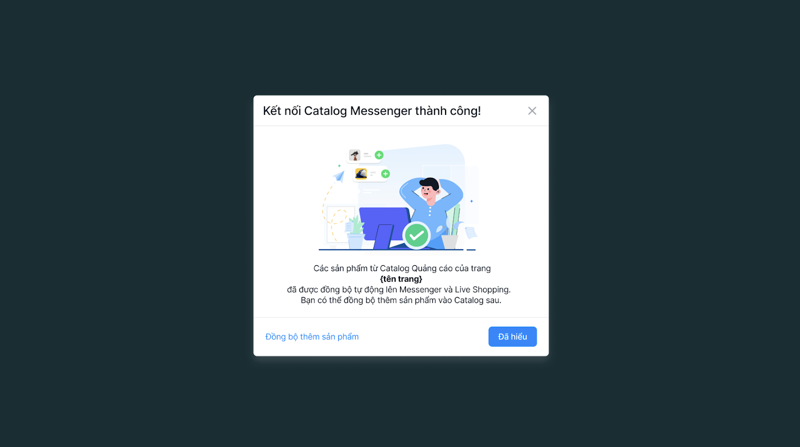 - Khi này, các sản phẩm từ Catalog quảng cáo đã được đồng bộ sang Catalog Messenger và Facebook Liveshopping. Bạn vẫn có thể ấn Đồng bộ thêm sản phẩm vào Catalog nếu muốn.