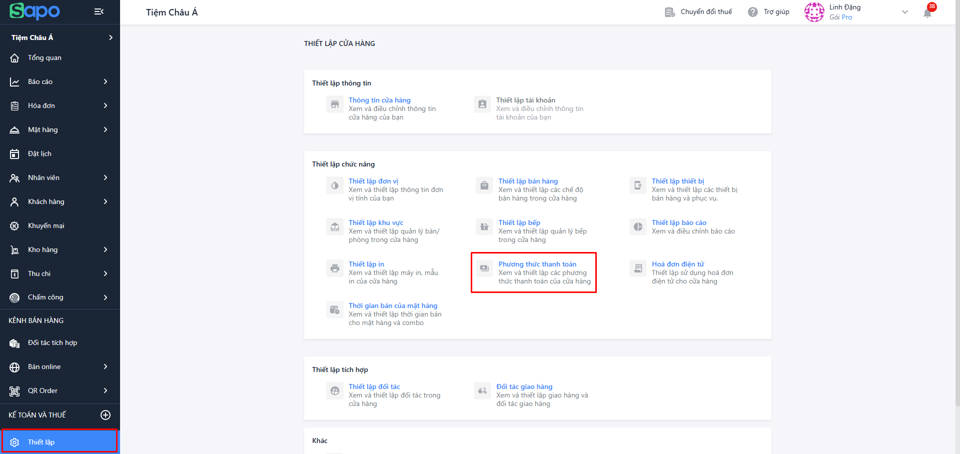 - Tại thanh menu bên trái màn hình Sapo FnB, chọn Thiết lập (biểu tượng bánh răng) > Tìm mục Thiết lập chức năng > Chọn Phương thức thanh toán, hệ thống hiển thị màn hình Danh sách Phương thức thanh toán.
