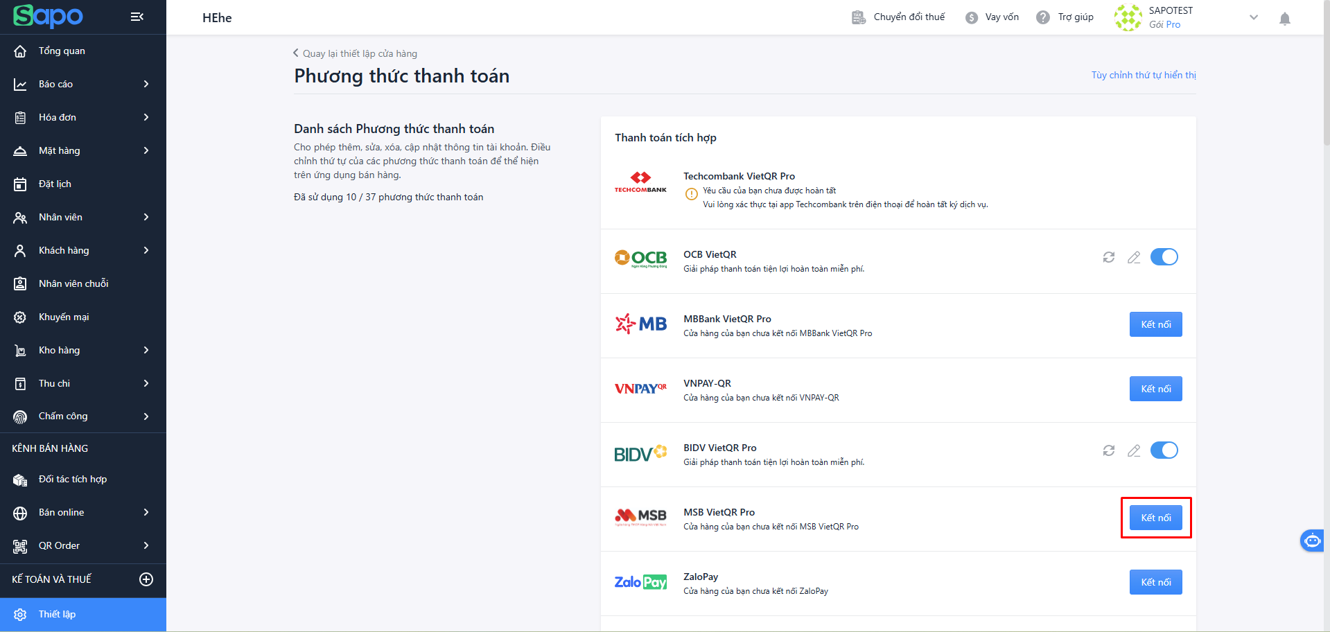 - Tại mục Thanh toán tích hợp, nhấn nút Kết nối nằm ở cuối dòng MSB VietQR PRO, hệ thống hiển thị màn hình Đăng ký dịch vụ MSB VietQR PRO.