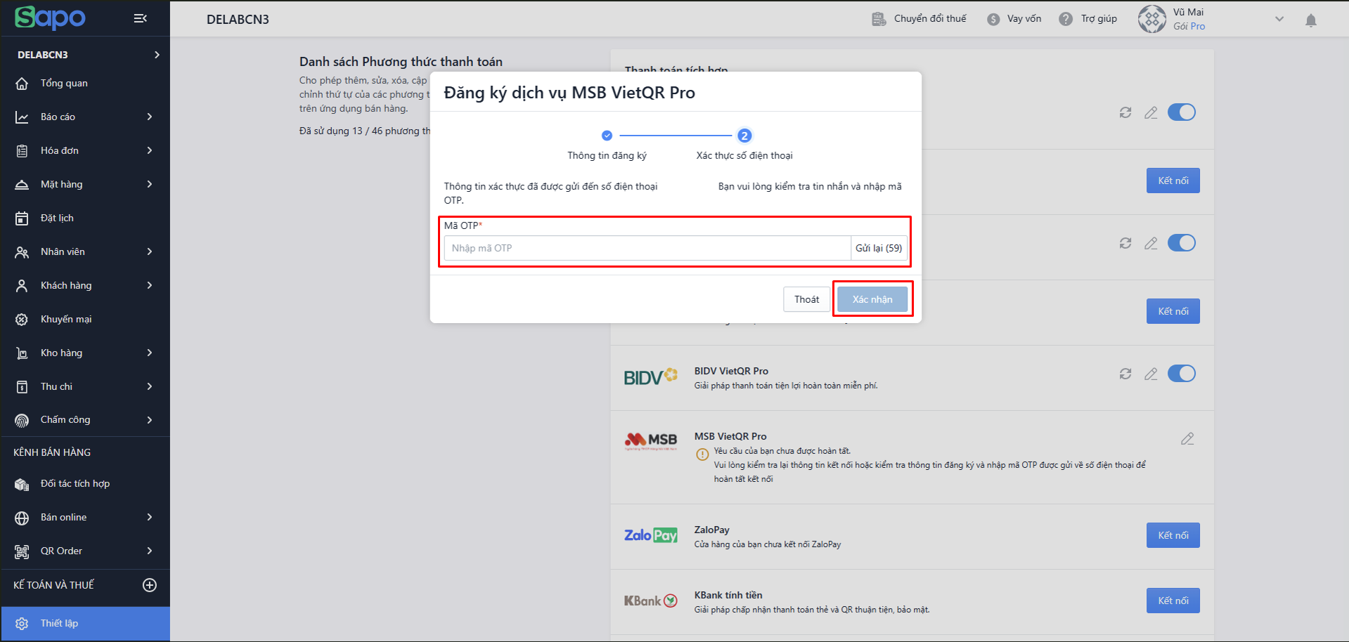 Bước 3: Nhập mã xác thực OTP và hoàn tất kết nối