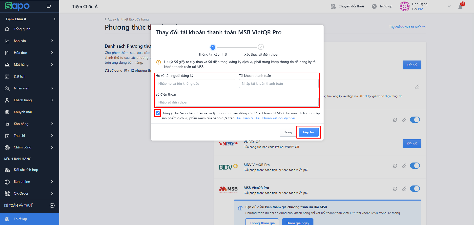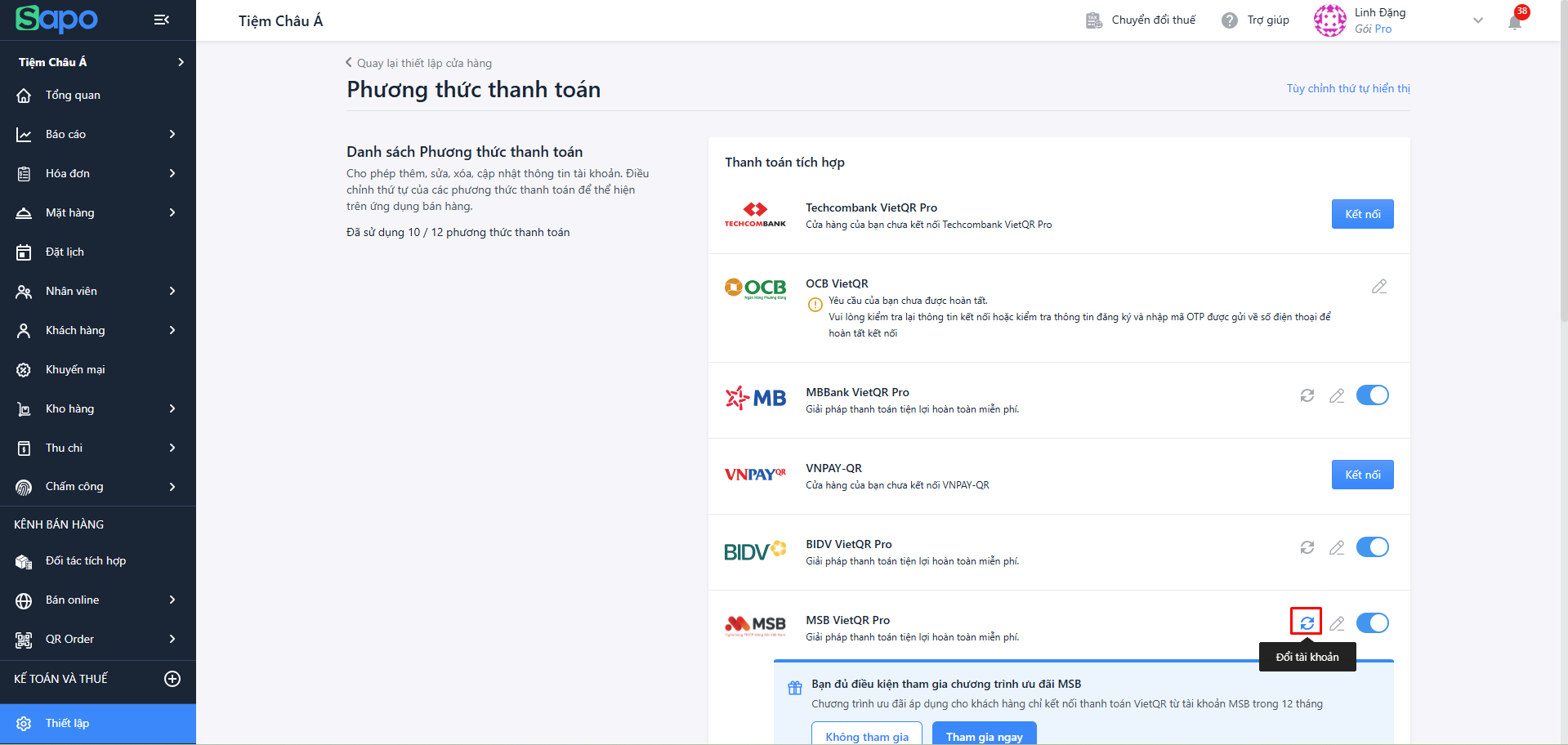 Tính năng Kết nối phương thức thanh toán MSB VietQR trên Sapo FnB giúp nhà hàng liên kết tài khoản ngân hàng MSB với hệ thống để triển khai thanh toán QR ngay tại quầy. Sau khi kết nối thành công, cửa hàng có thể tạo mã VietQR theo từng đơn hàng, giúp khách thanh toán nhanh chóng, hạn chế sai sót và hỗ trợ quản lý giao dịch, dòng tiền hiệu quả.