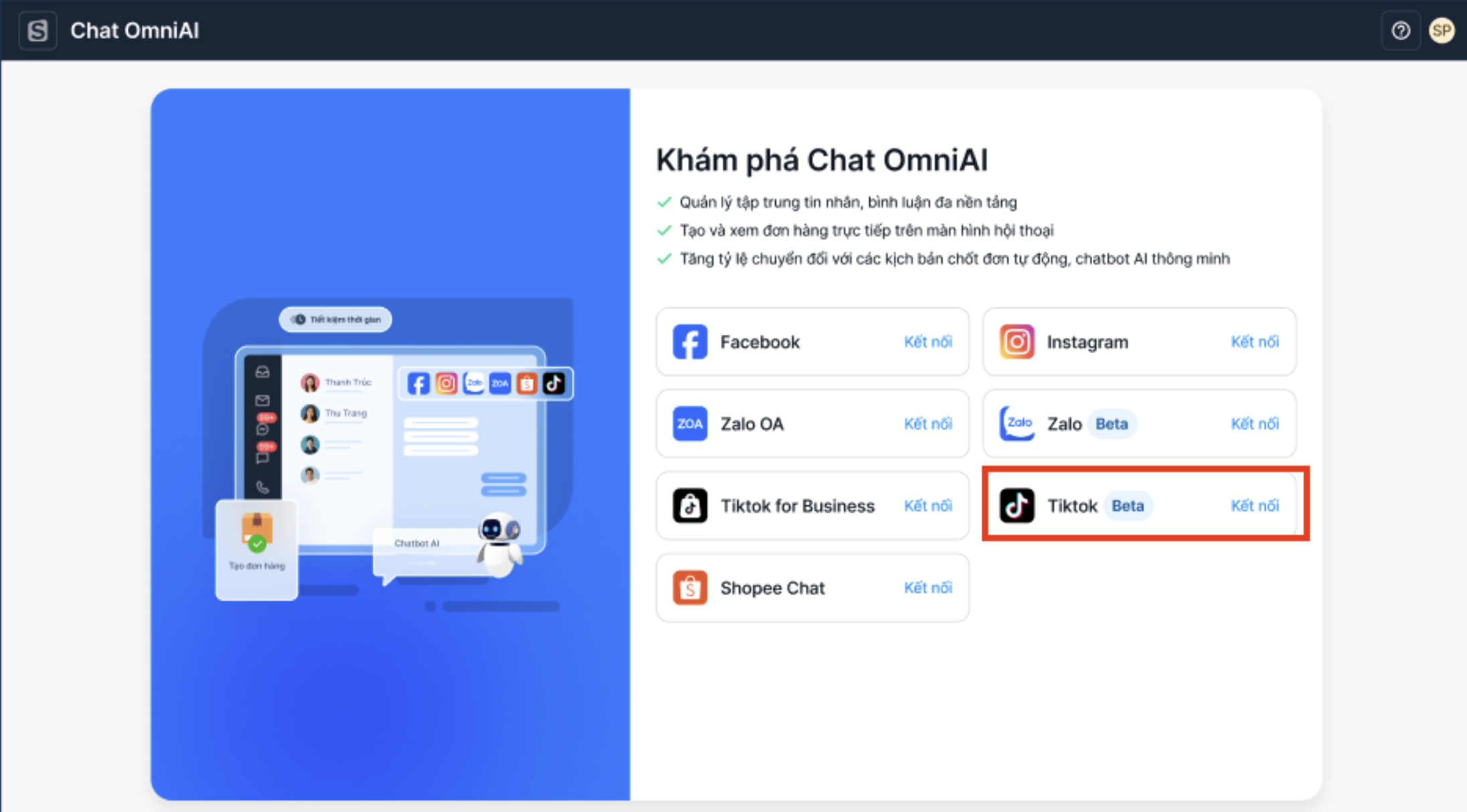 - Tại màn hình Danh sách kênh có thể kết nối, chọn nút Kết nối tại vị trí kênh TikTok (Beta).