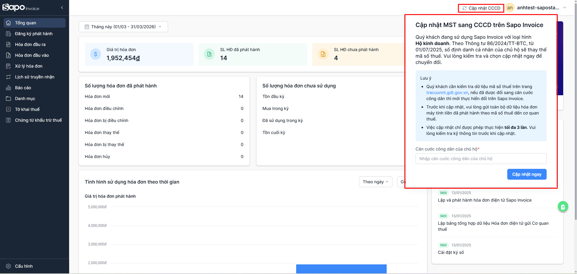 Trong trường hợp Hộ kinh doanh đã chuyển đổi từ Mã số thuế (MST) sang Số định danh cá nhân (CCCD), nhưng thực tế vẫn phát sinh hóa đơn đầu vào theo cả hai thông tin người mua (MST và CCCD), hệ thống Sapo Invoice chỉ có thể đồng bộ hóa đơn theo mã đang được kích hoạt tại thời điểm đó.