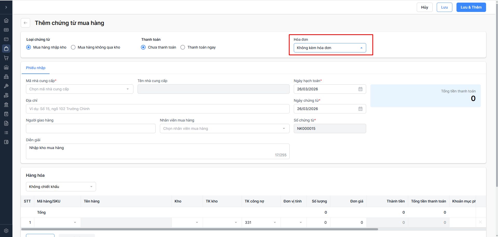 Mua hàng không kèm hóa đơn trên Sapo Accounting - Doanh nghiệp (DN)