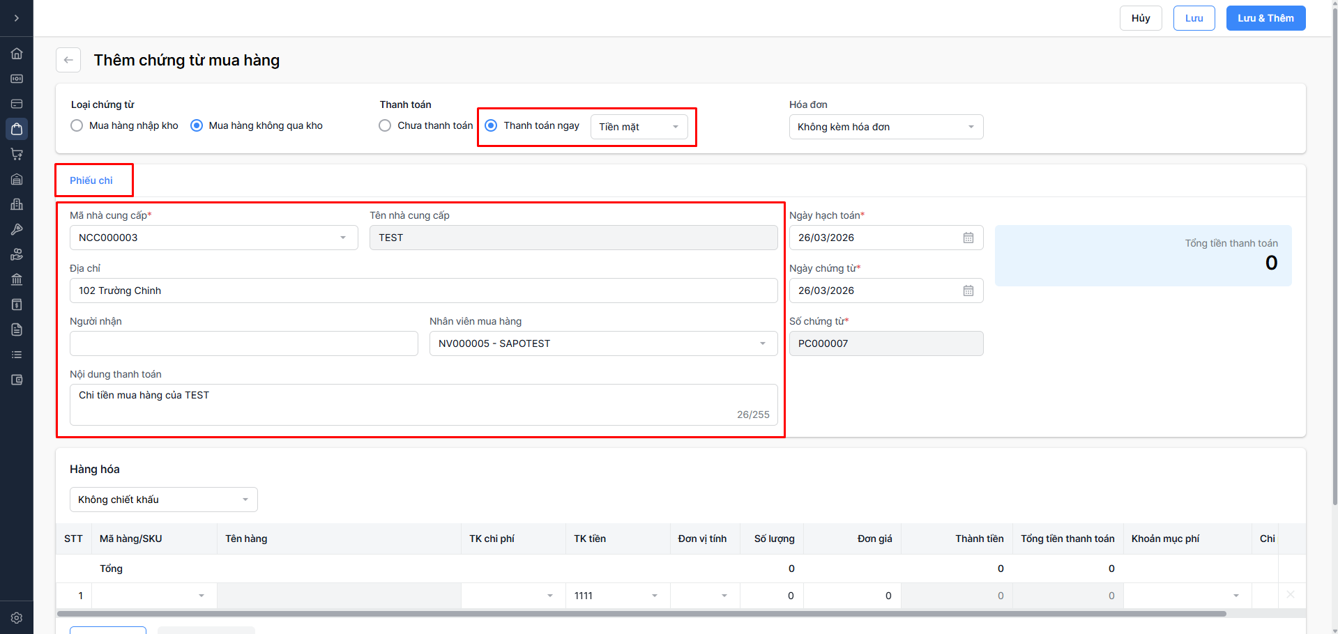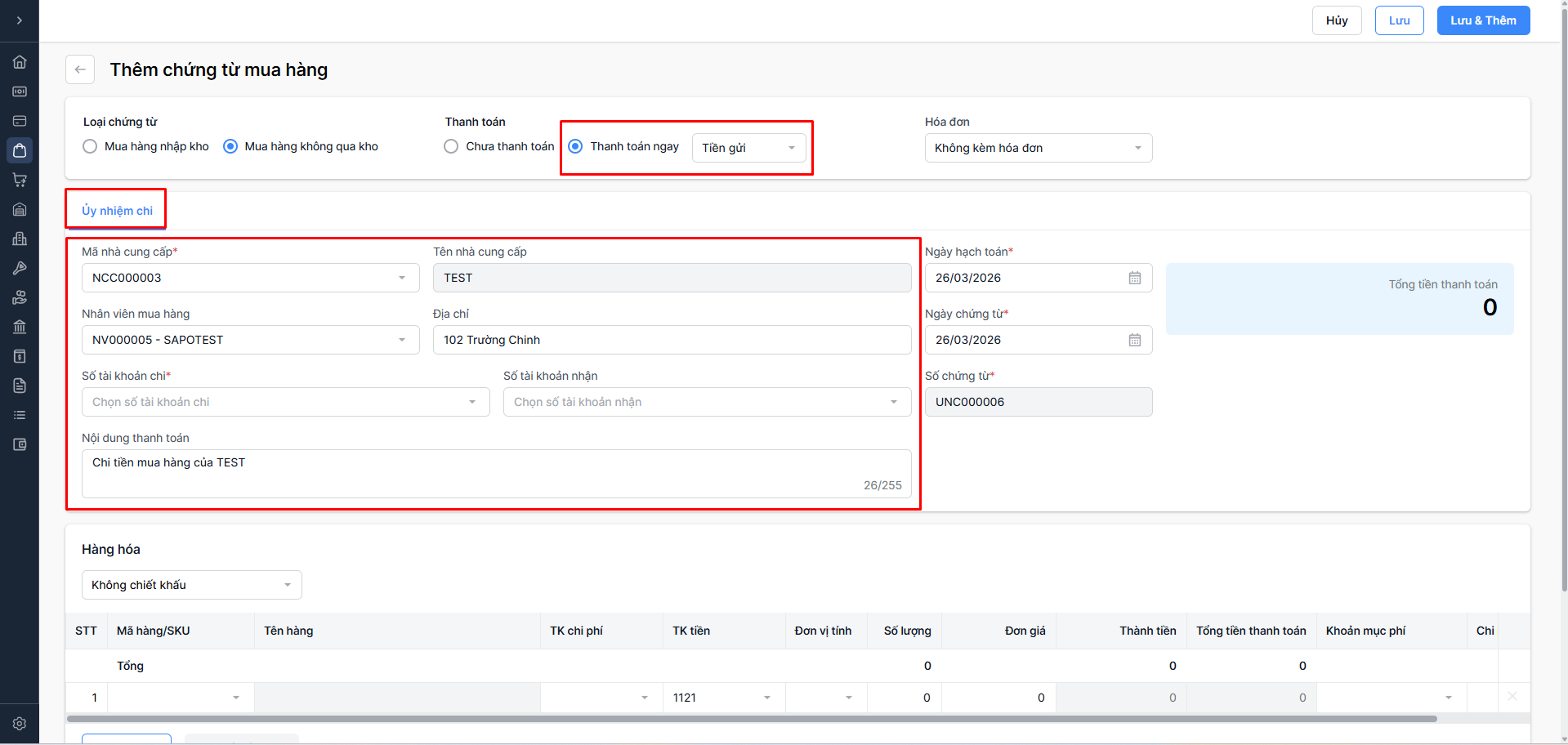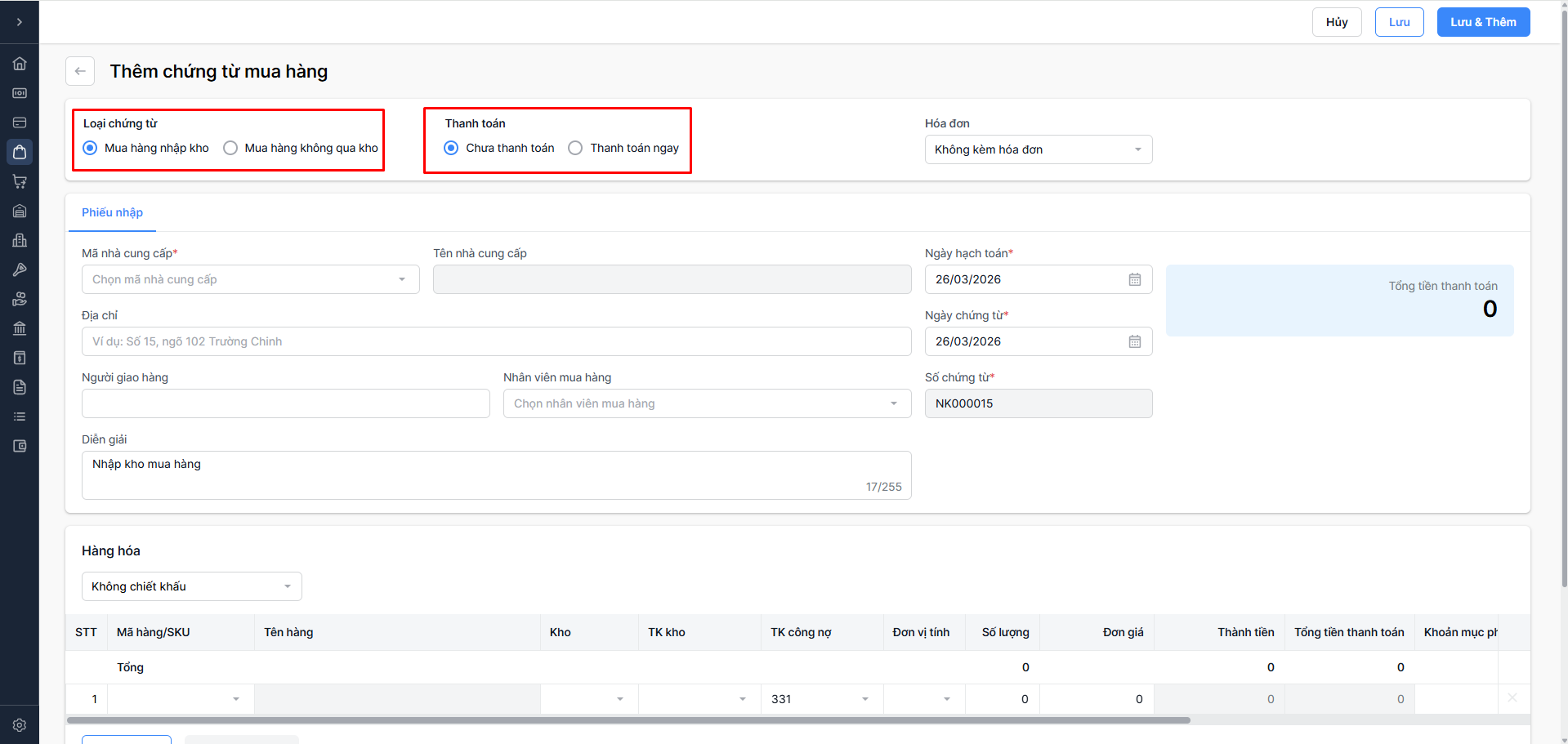 Thanh toán ngay: Mua hàng trả tiền ngay (Chọn Tiền mặt hoặc Tiền gửi)