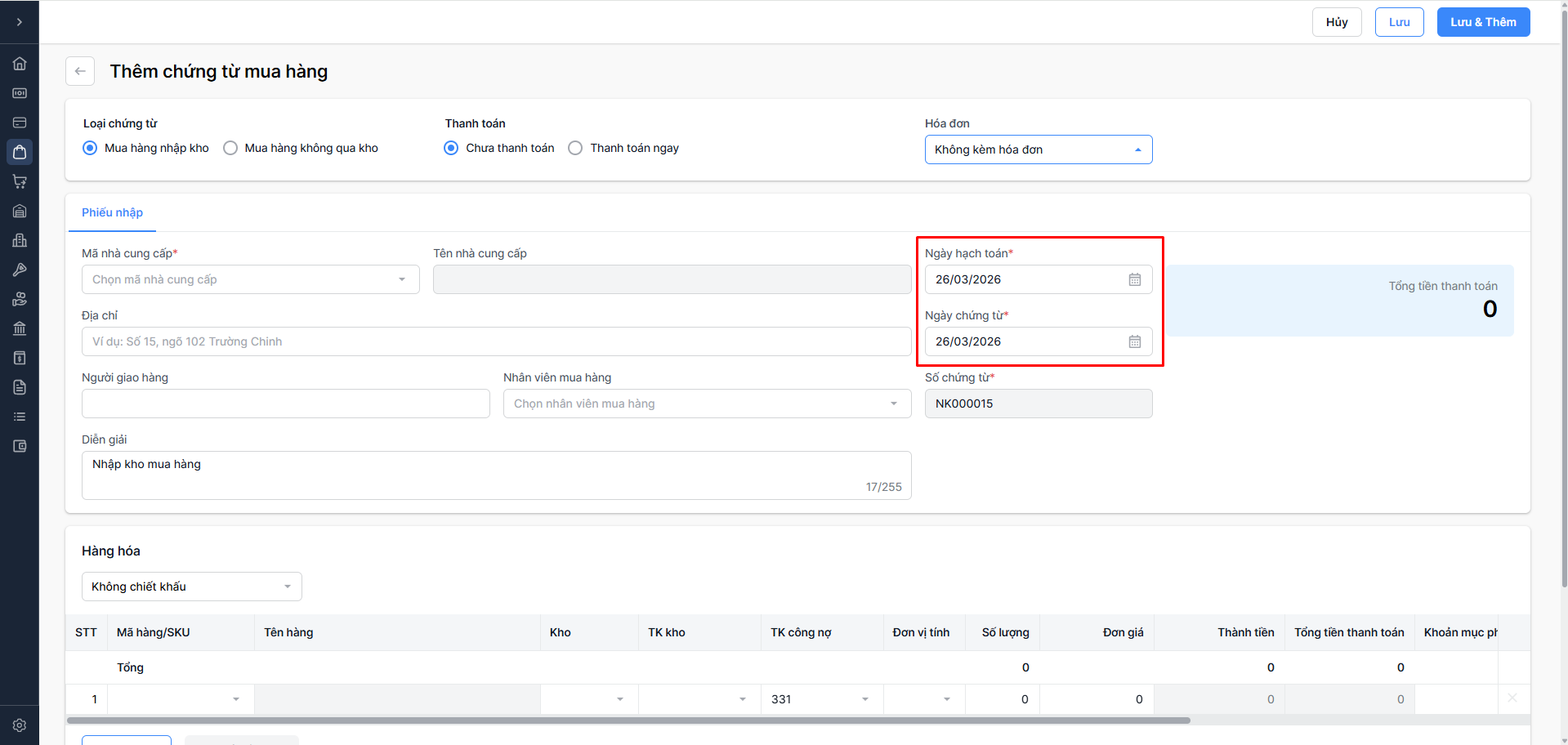 Ngày hạch toán (bắt buộc): Ngày ghi sổ kế toán