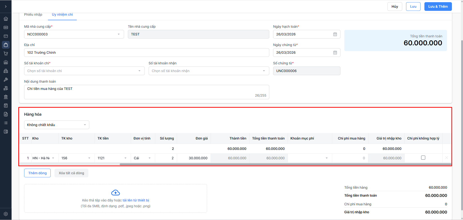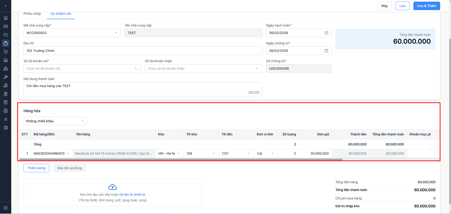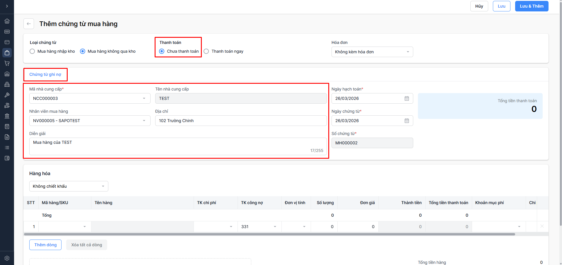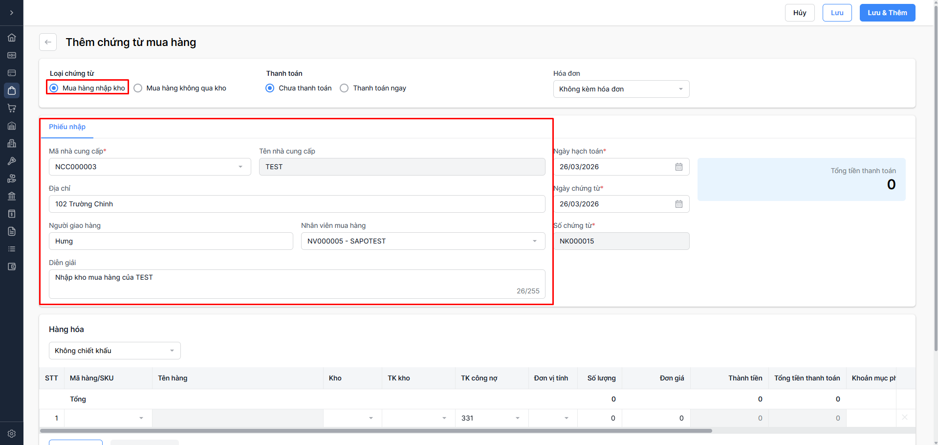TH1: Không có chiết khấu → Không cần nhập thông tin chiết khấu
