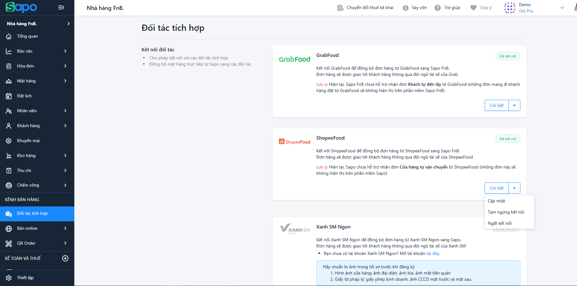 - Tại thanh Menu bên trái màn hình trang chủ Sapo FnB, bạn tìm tới mục Kênh bán hàng và nhấn chọn Đối tác tích hợp, màn hình hiển thị tất cả những đối tác của Sapo FnB.