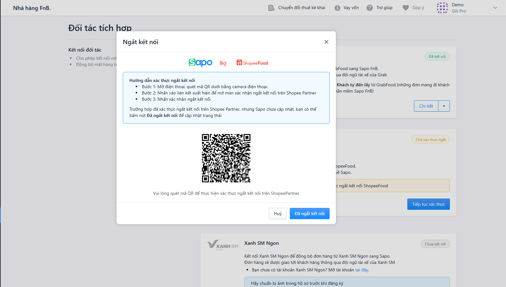 Tính năng Ngắt kết nối ShopeeFood cho phép chủ cửa hàng chủ động hủy liên kết gian hàng ShopeeFood với phần mềm Sapo FnB ngay trên hệ thống mà không cần thông qua bộ phận trung gian. Quá trình ngắt kết nối được bảo mật bằng hình thức xác thực QR Code, đảm bảo an toàn dữ liệu và hạn chế thao tác nhầm.