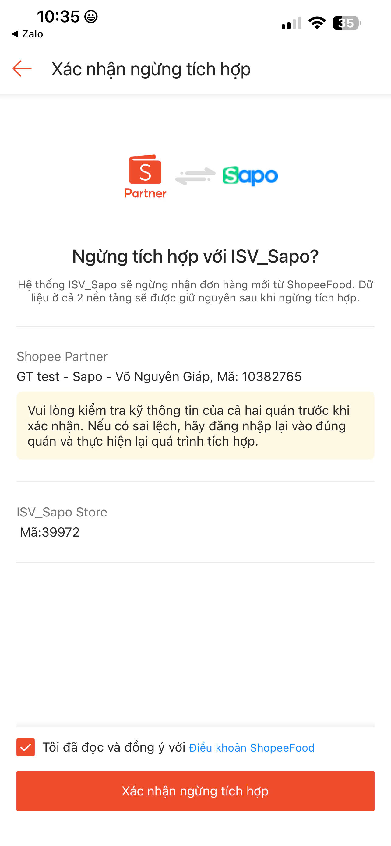 - Sau khi ngắt kết nối, dữ liệu thực đơn và đơn hàng từ ShopeeFood sẽ không còn đồng bộ về Sapo.