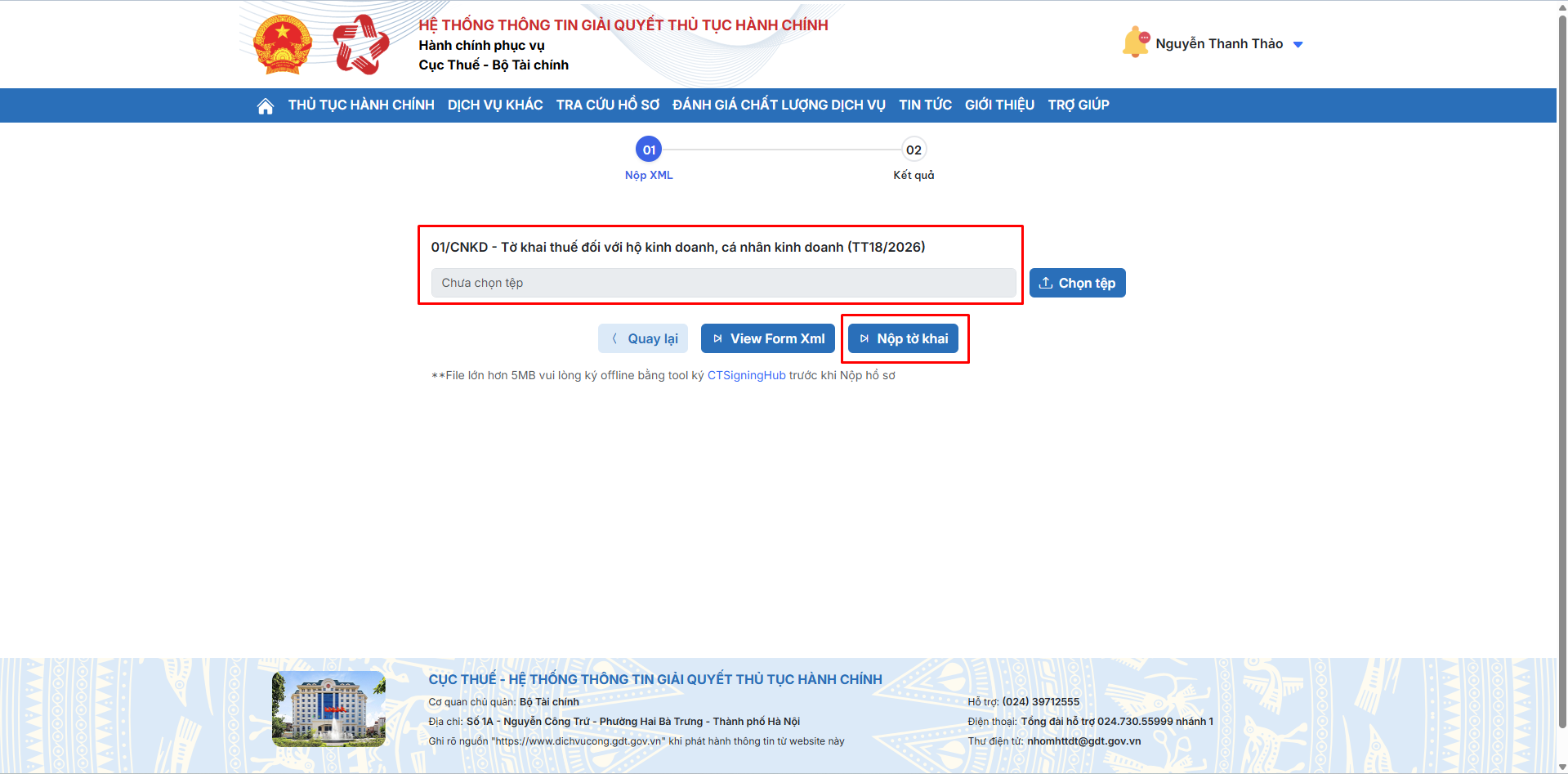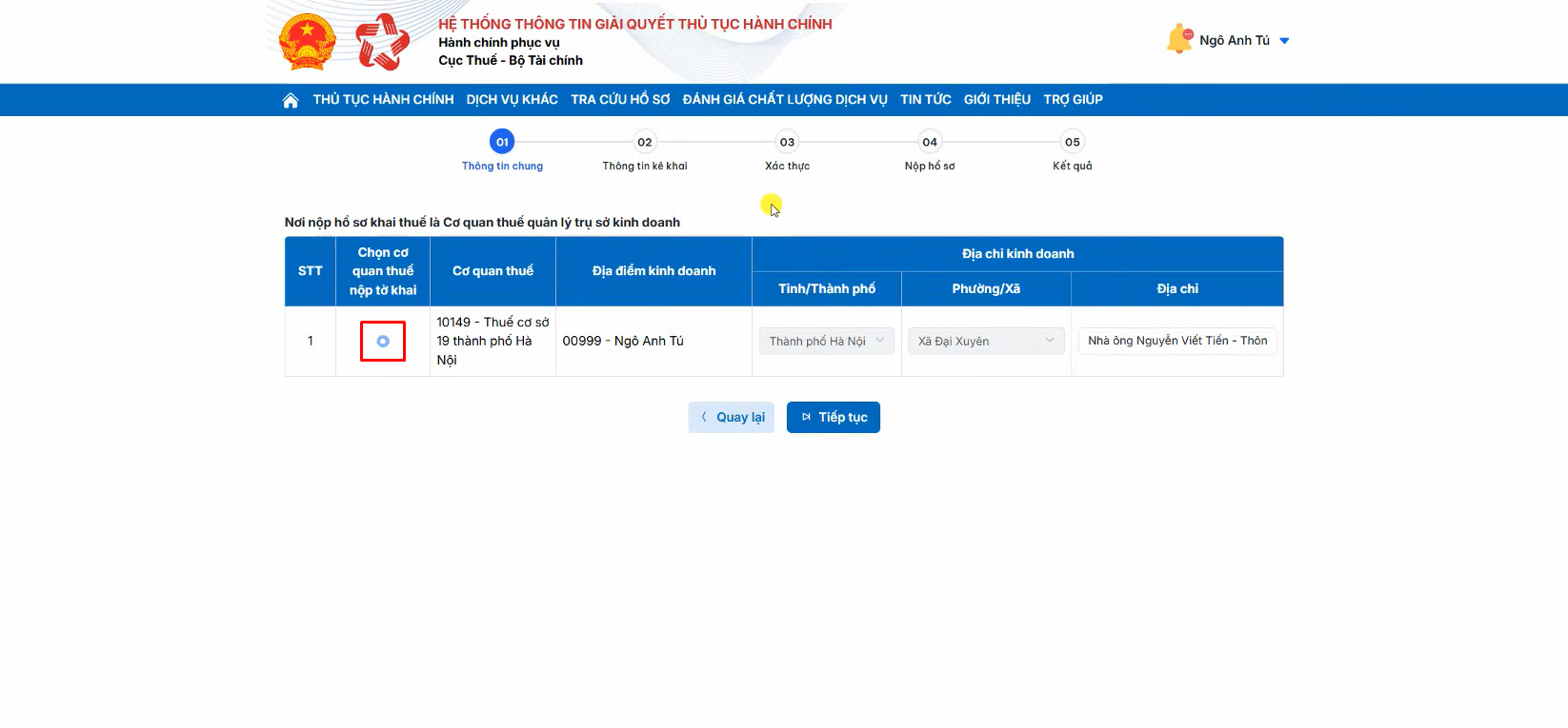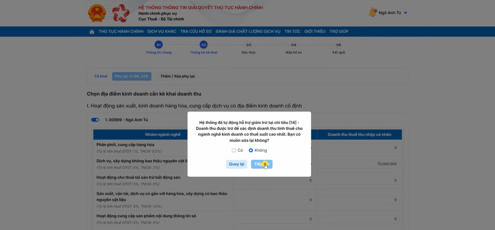Sau khi hoàn tất bạn chọn Tiếp tục, hệ thống sẽ điều hướng sang màn hình tờ khai thuế đầy đủ.