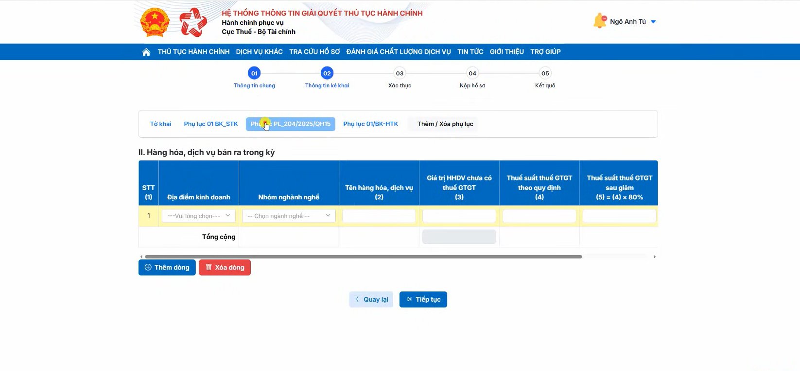 Bạn chọn thêm tab Phụ lục PL-204/2025/QH15 để khai báo các hàng hóa, dịch vụ giảm thuế có phát sinh doanh thu trong kỳ kê khai.