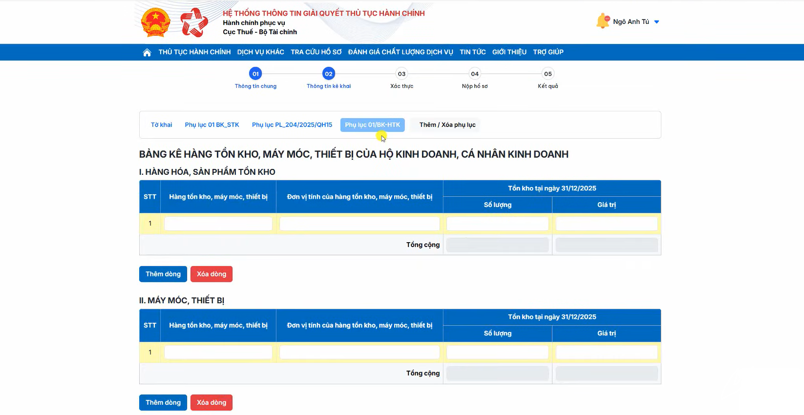 Bạn chọn thêm tab Phụ lục 01/BK-HTK để khai báo thông tin hàng tồn kho và tài sản (máy móc, thiết bị) của hộ kinh doanh tại thời điểm cuối kỳ.