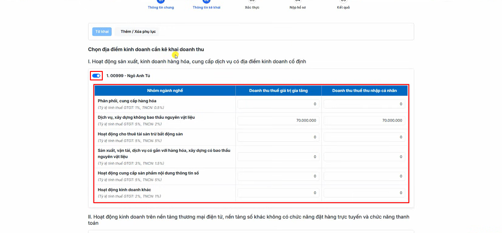 - Mục II: Hoạt động kinh doanh trên nền tảng thương mại điện tử, nền tảng số khác không có chức năng đặt hàng trực tuyến và chức năng thanh toán - Dành cho doanh thu từ các nền tảng mạng xã hội, website trực tuyến