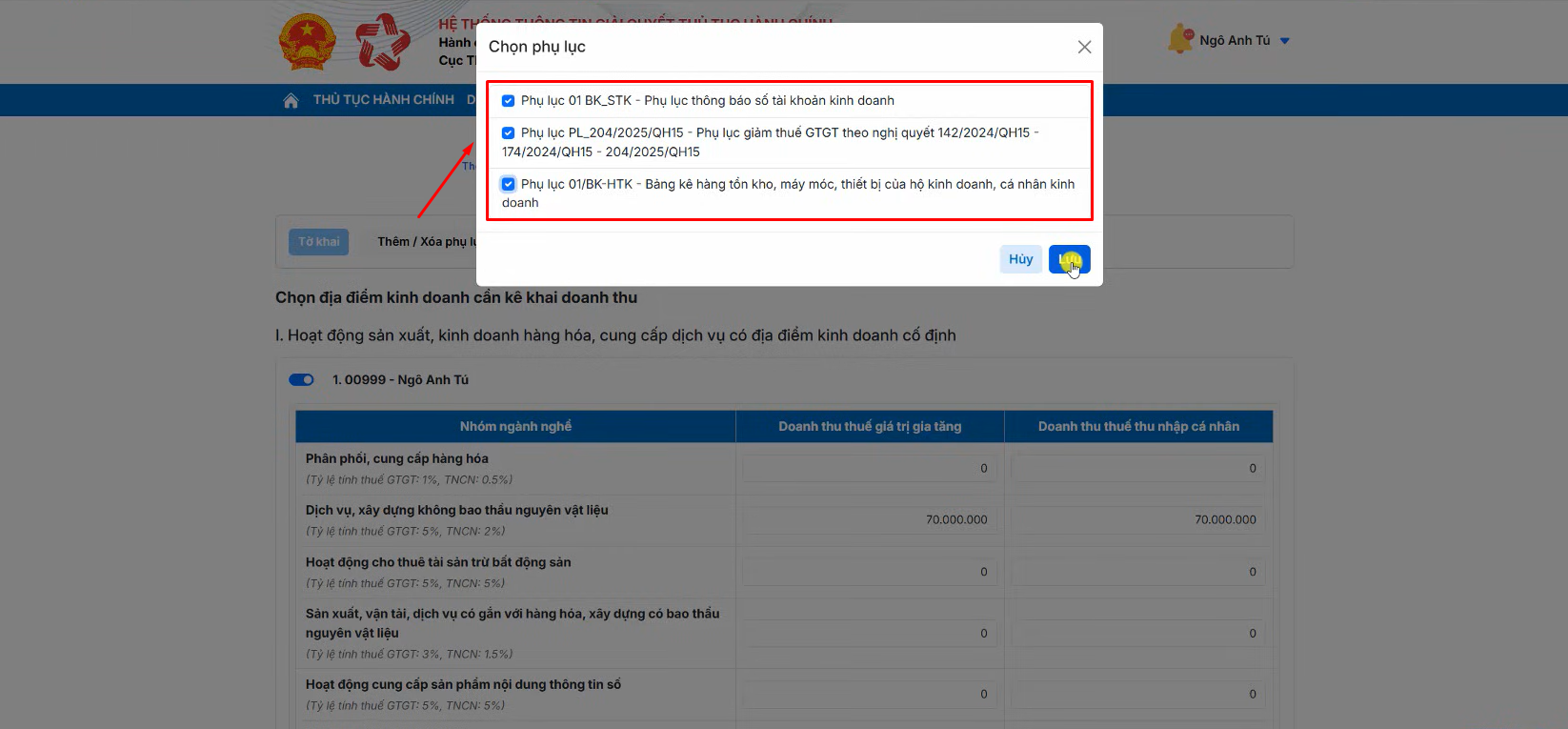 Bạn thực hiện kê khai doanh thu cho địa điểm kinh doanh theo từng nhóm ngành nghề.