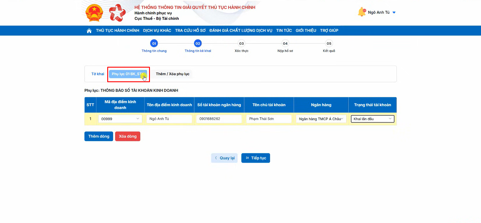 Bạn chọn thêm tab Phụ lục 01/BK-STK để khai báo số tài khoản, ví điện tử của hộ, cá nhân kinh doanh.
