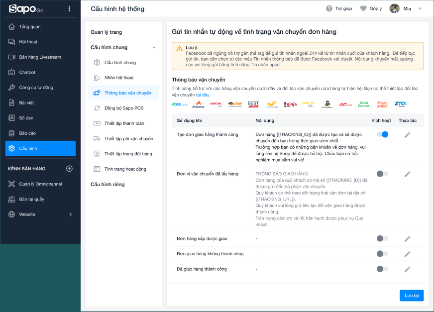 - Nhấn vào biểu tượng kích hoạt để Bật/Tắt mẫu tin nhắn cho từng trạng thái (Tạo đơn thành công, Đã lấy hàng, Sắp giao hàng, Giao không thành công, Đã giao hàng).