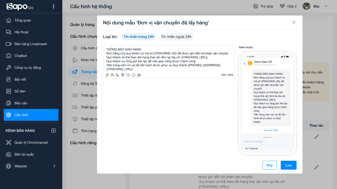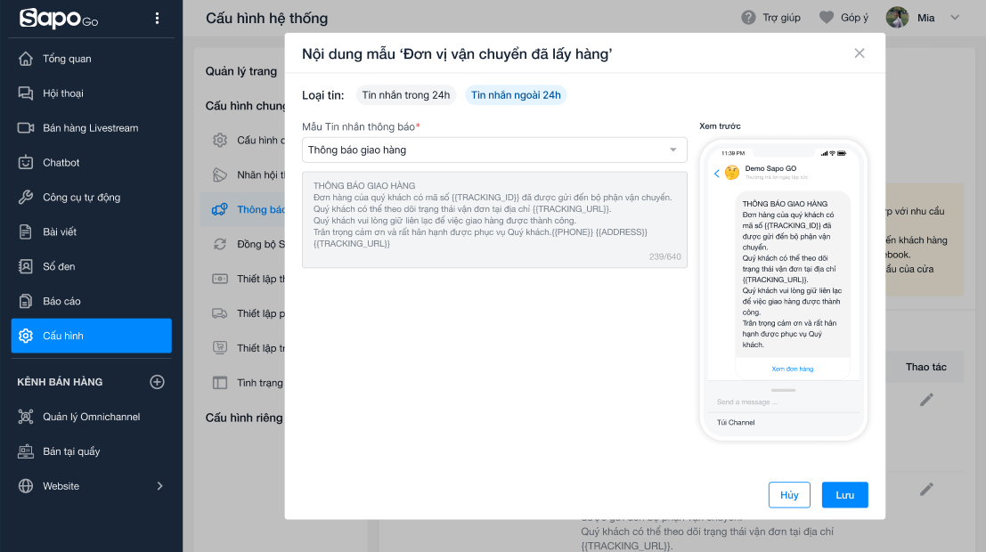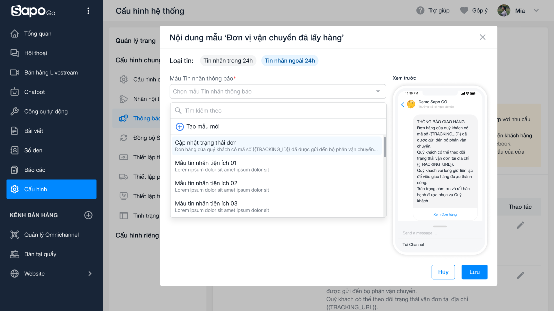Để thiết lập mẫu tin nhắn gửi tới khách hàng, bạn thực hiện: