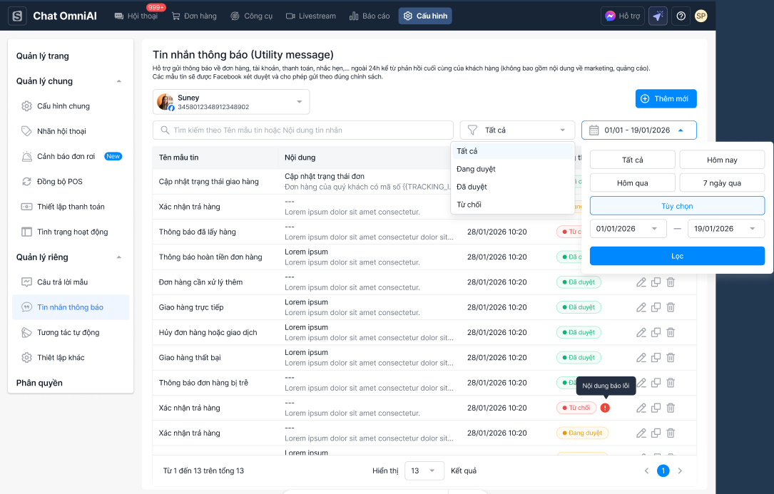 Tại màn hình Danh sách Tin nhắn Thông báo, bạn có thể lọc xem mẫu tin nhắn theo các tiêu chí: